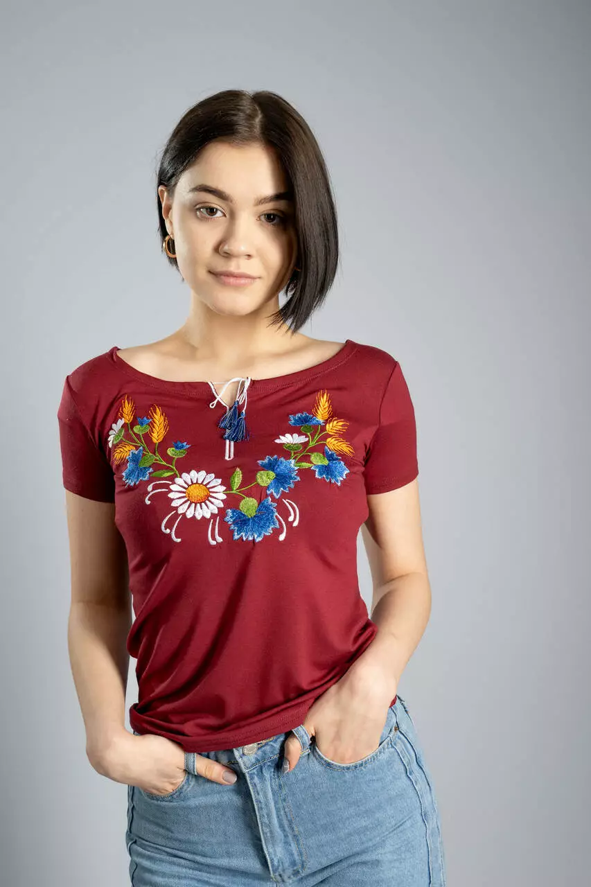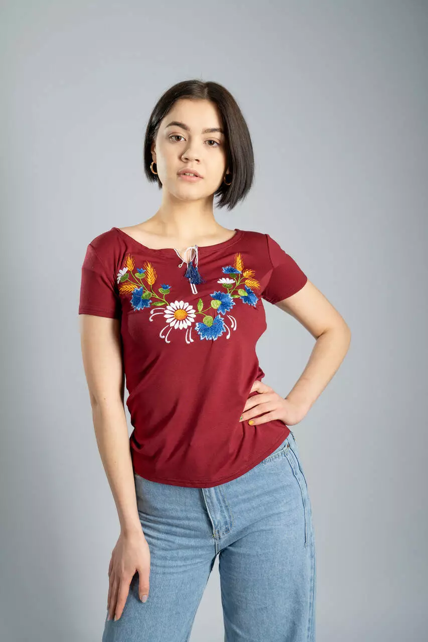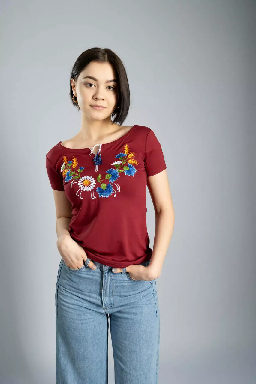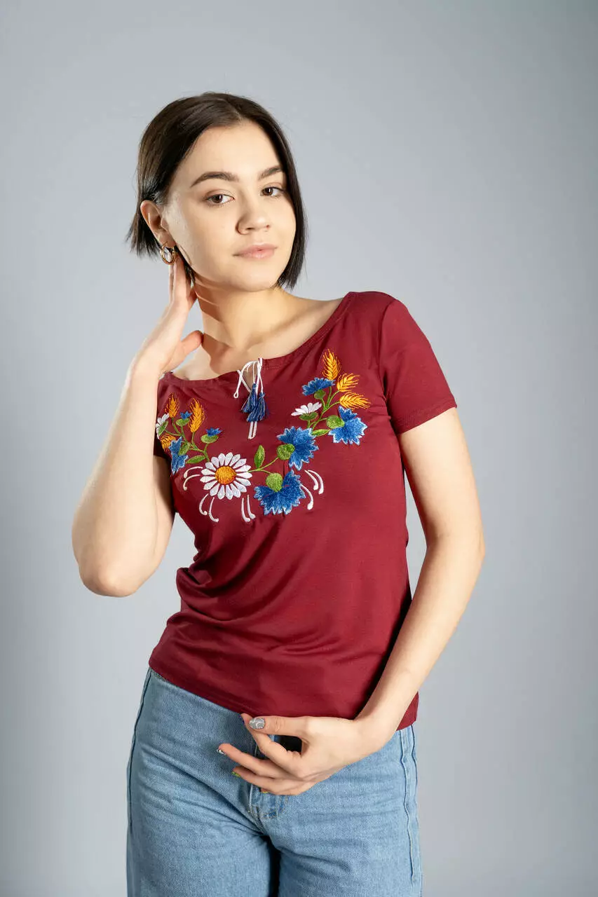 Бордова жіноча футболка з квітковою вишивкою "Віночок"