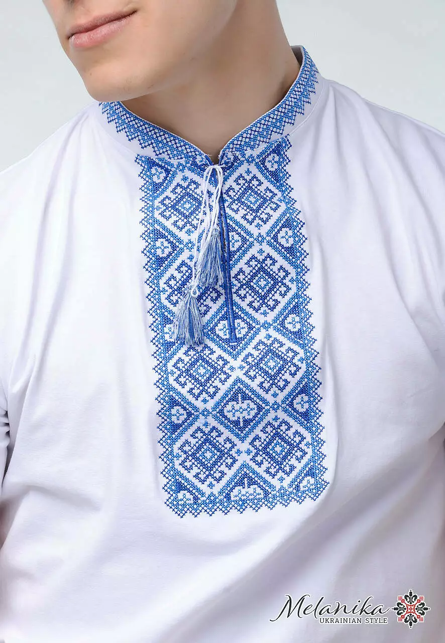 Для створення цієї моделі фахівці “Меланіки” використали високоякісні матеріали. Основна тканина білого кольору - 95% бавовна. Ця вишита чоловіча футболка прикрашена машинною вишивкою. Дивовижна вишита стійка виконана кількома відтінками небесно-синього кольору. Ви маєте можливість купити етнічну річ з унікальними орнаментами.
