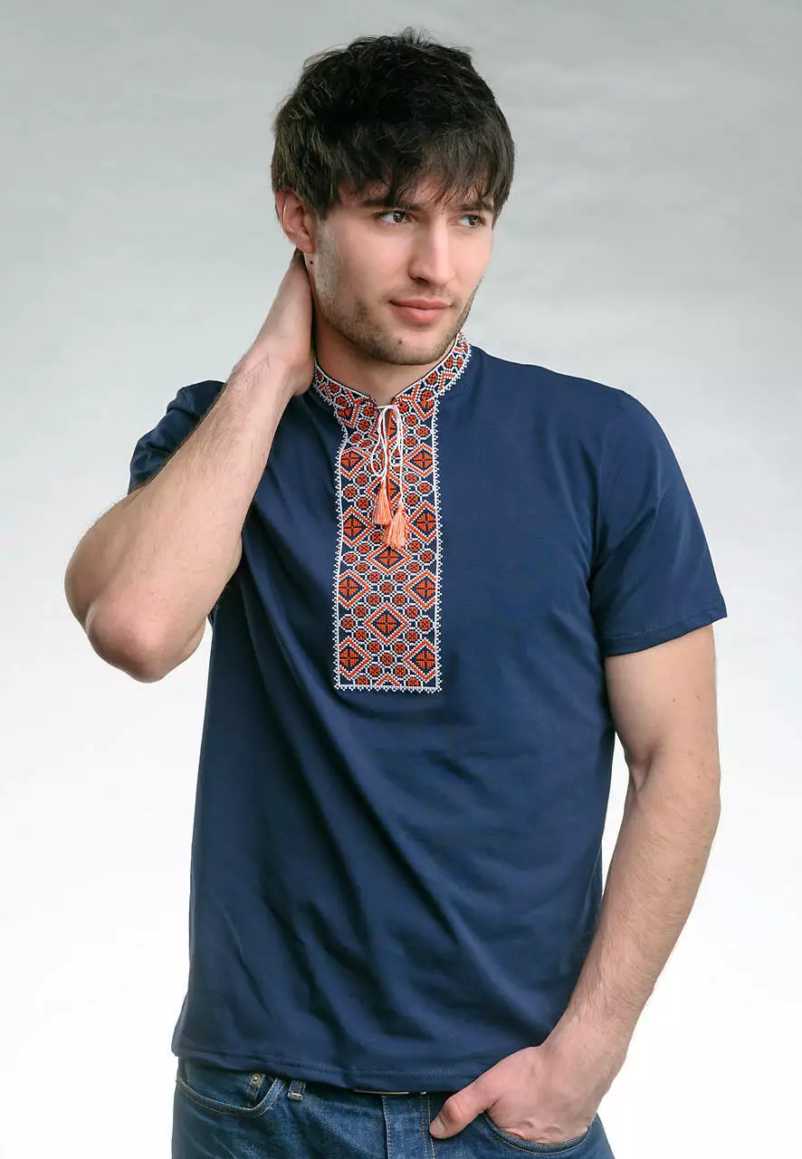 Річ вироблена із високоякісного матеріалу – бавовни. Для вишивки використовувалися елементи слов'янської вишивки. Реалізовувалася машинною технікою білими та кораловими нитками на тканині темно-синього кольору. Все для того, щоб ви отримали нашу футболку у найкращому вигляді.