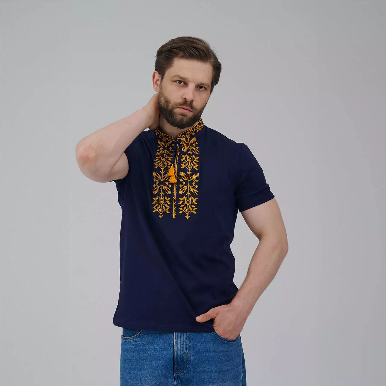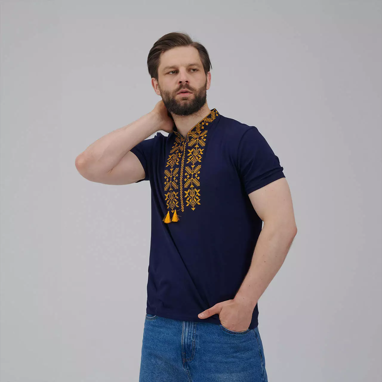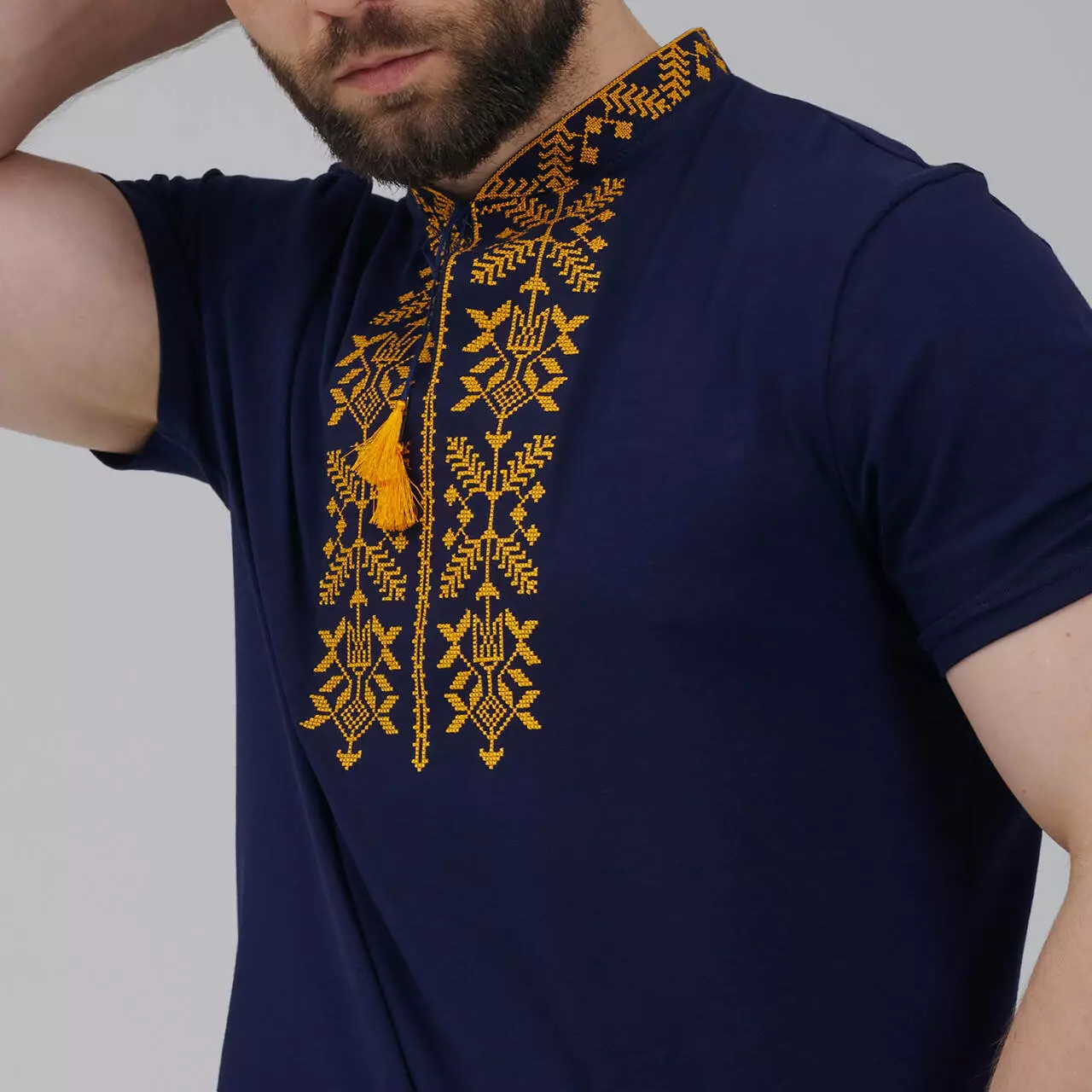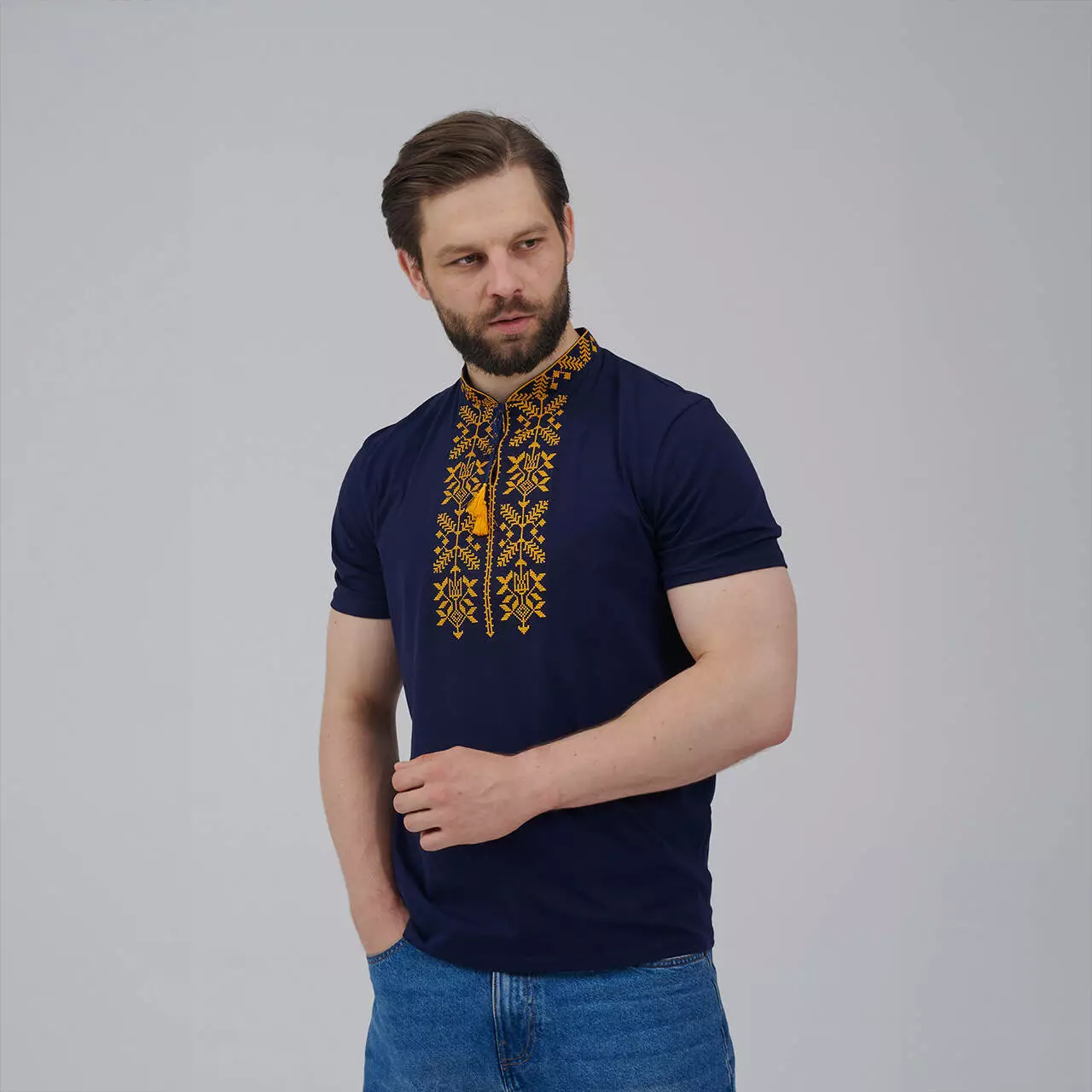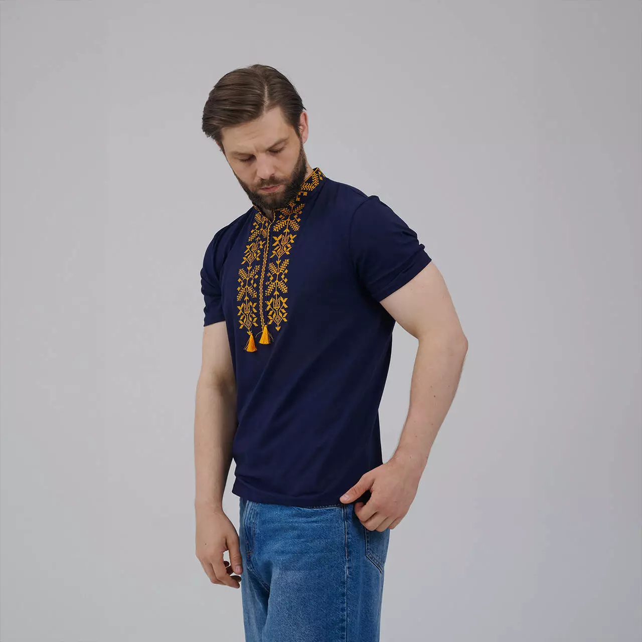 Чоловіча вишита футболка на синій тканині з контрастною оранжевою