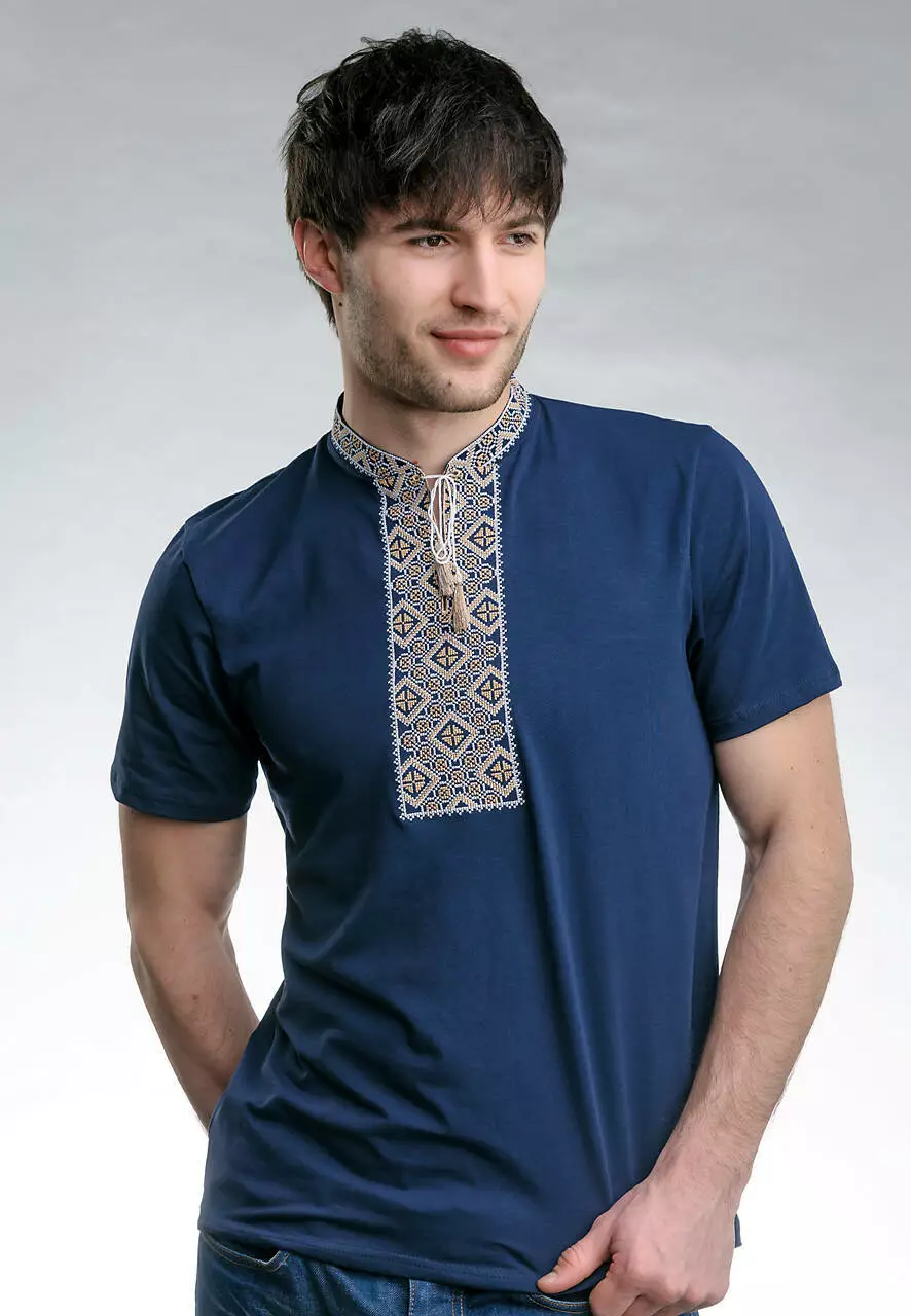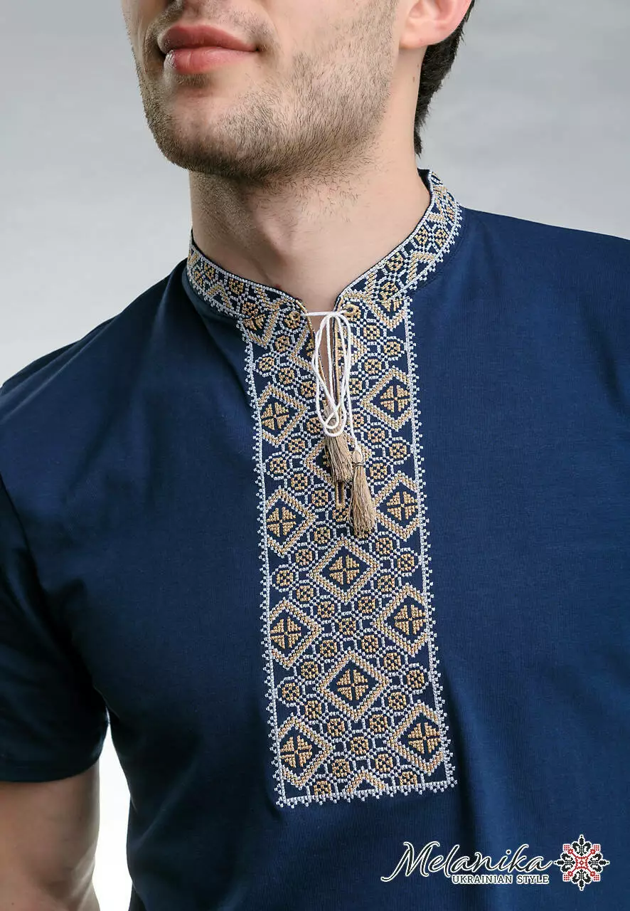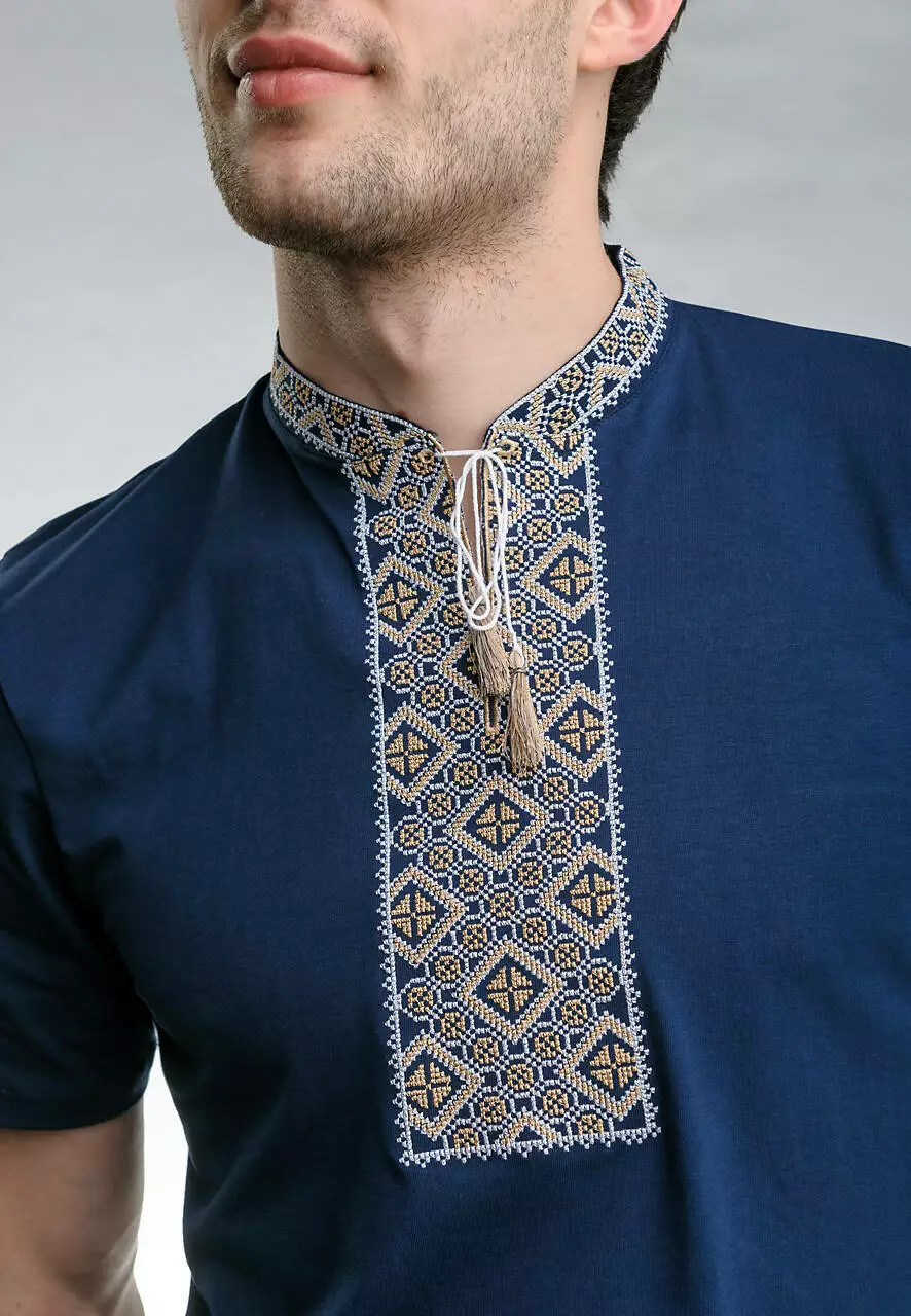 Вишивка виконана на тканині темно-синього кольору бежевими нитками. Матеріал – бавовна. Футболка вдало поєднується із улюбленими джинсами чи класичним костюмом. Вона пасуватиме і на щодень, і на свята.