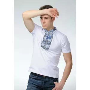 Пропонуємо звернути увагу на унікальні орнаменти цієї вишитої футболки. Блакитні геометричні візерунки настільки гармонійно дивляться на цій білосніжній основній тканині, що просто неможливо відірвати погляд. Безсумнівно, це універсальна модель для буднів та свят.
