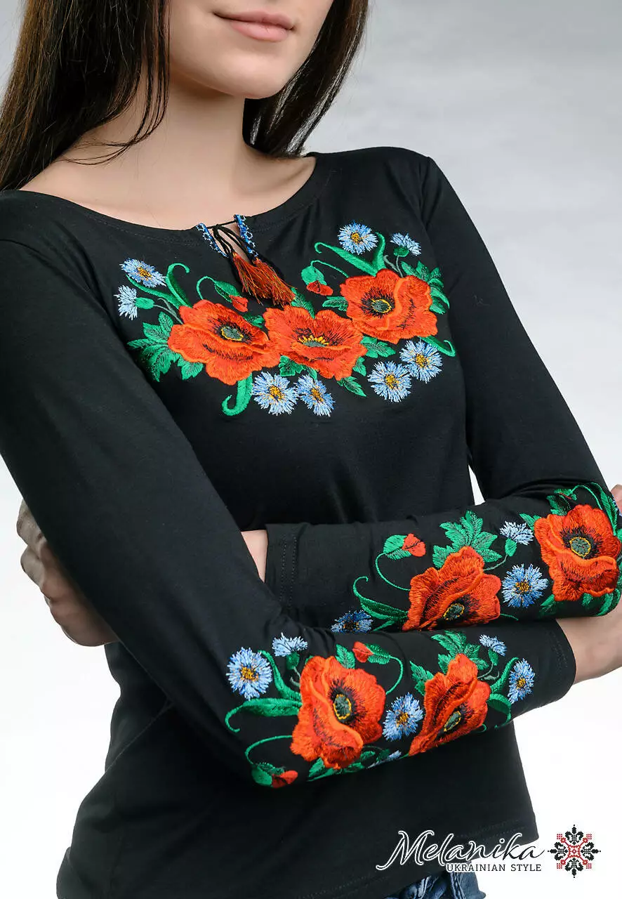 Чорна жіноча вишиванка із віскози миттєво перетворить вас на справжню зірку вечора, а знайомі закидають питаннями де саме ви купили таку модну жіночу вишиванку. Вишиванка чорного кольору прикрашена насиченим квітковим орнаментом на грудях та на рукавах. Оздоблення у вигляді традиційного візерунку із великих маків та волошок. Така вишиванка чудово підійде як на кожен день так і на свята. Одягайте її з джинсами чи шортами під кросівки, кеди чи мокасини - комбінуйте свій образ, як тільки хочете, але будьте впевнені, що він із цією чорною вишитою футболкою буде доречним. Носіть українське разом із нами.