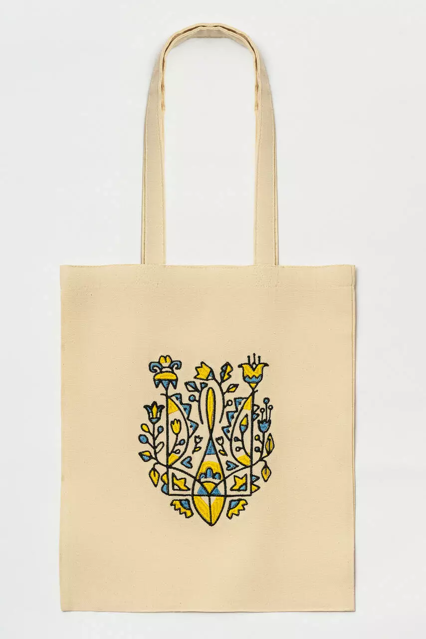 Еко-сумка для покупок "Тризуб квітковий" у бежевому кольорі із яскравою вишивкою доповнить ваш повсякденний образ для походів у супермаркет і заодно збереже природу.