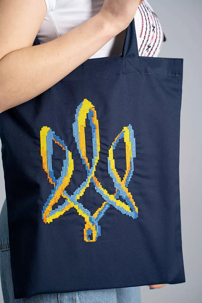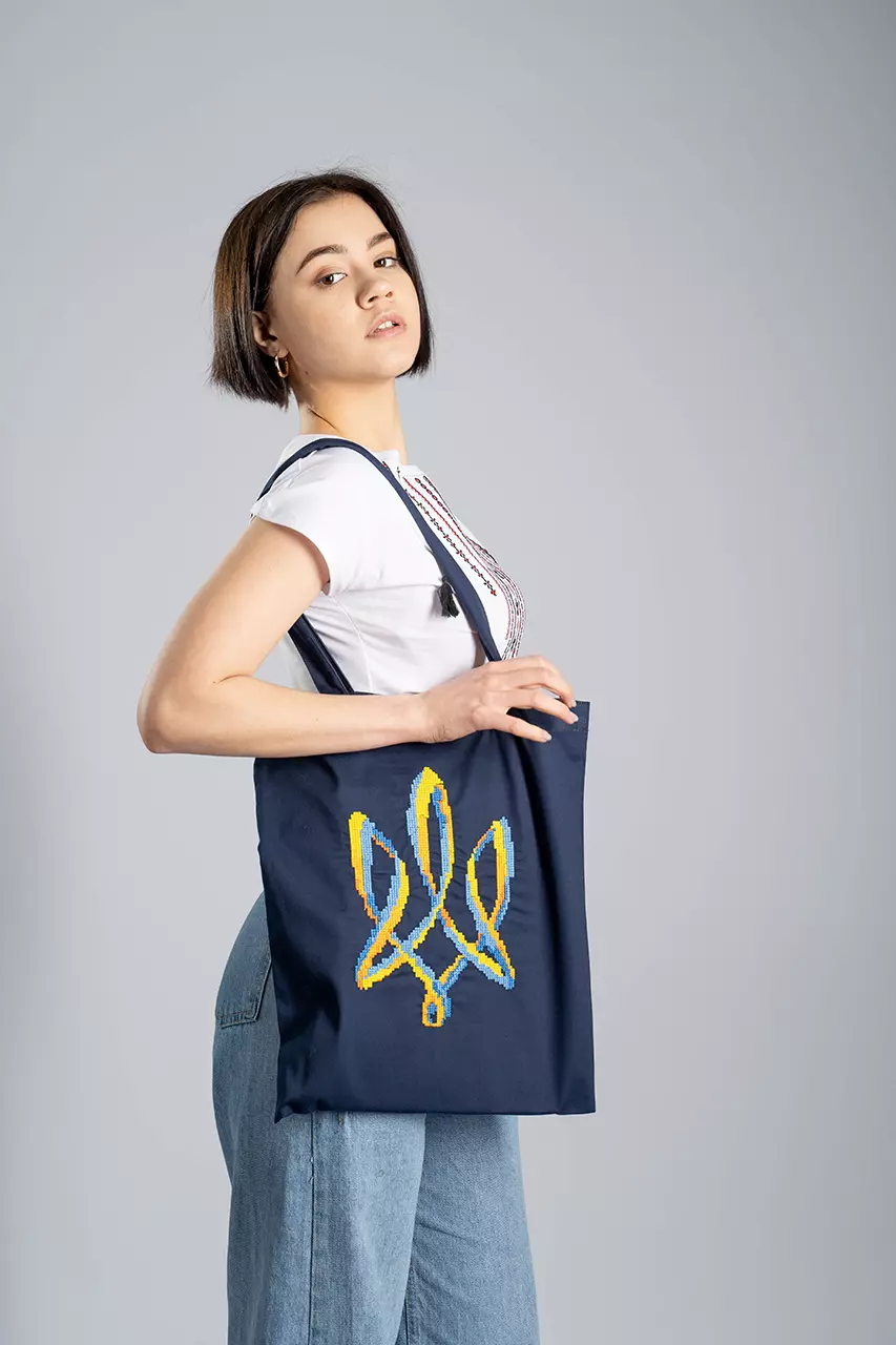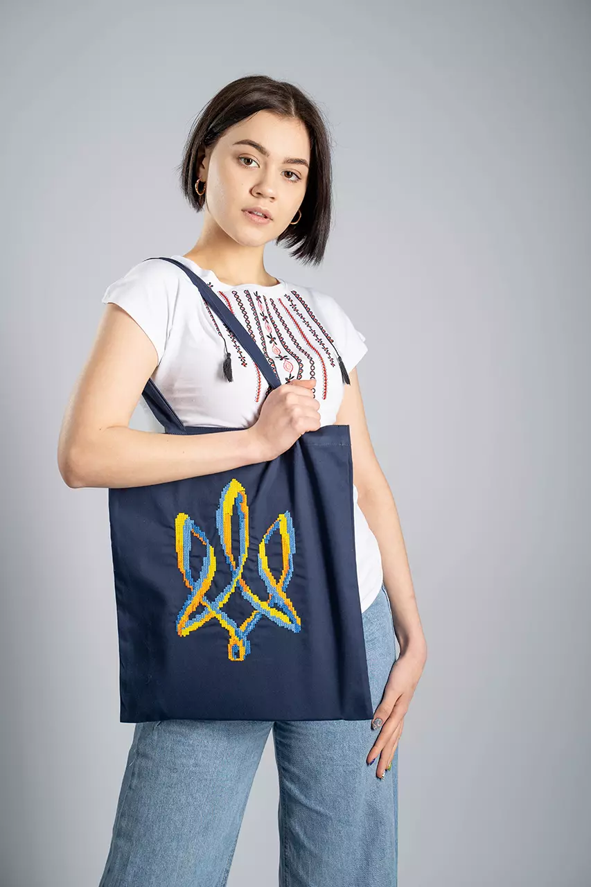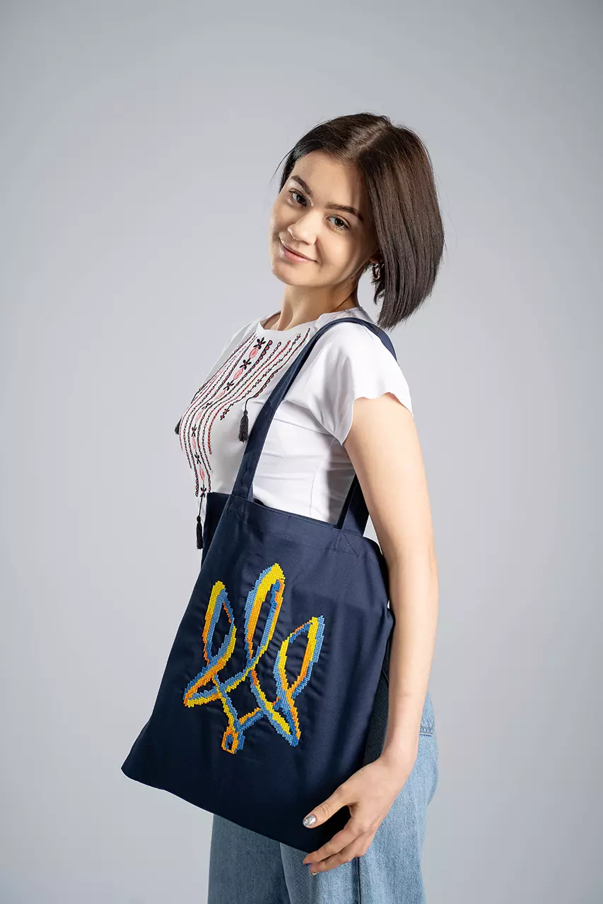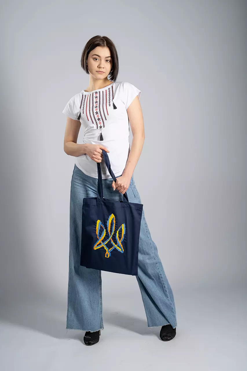 Еко-торба із патріотичною вишивкою у синьому кольорі "Тризуб"