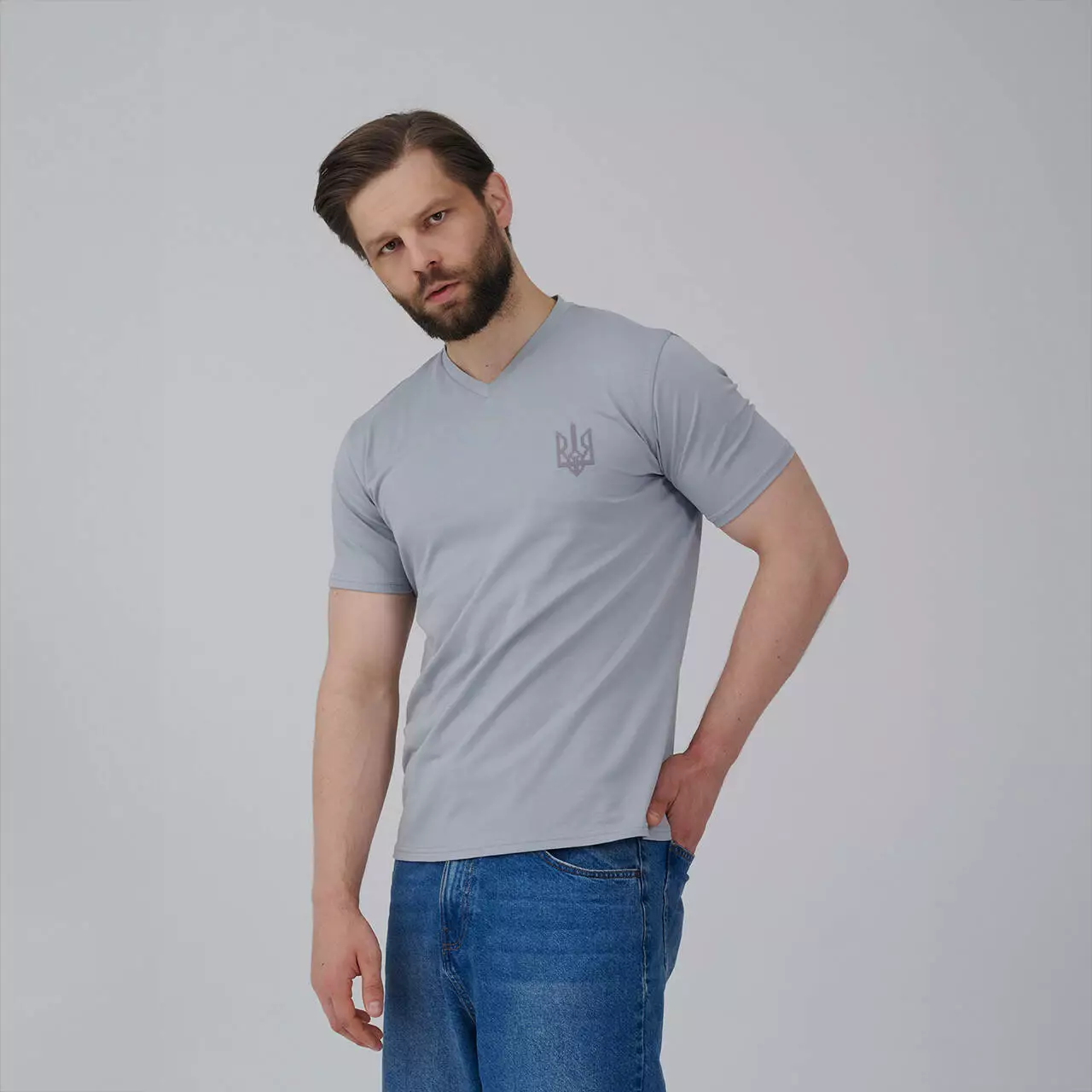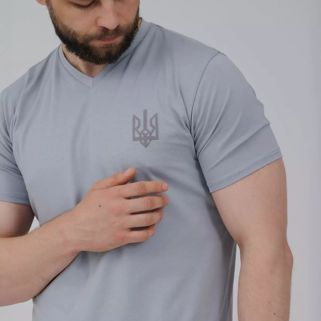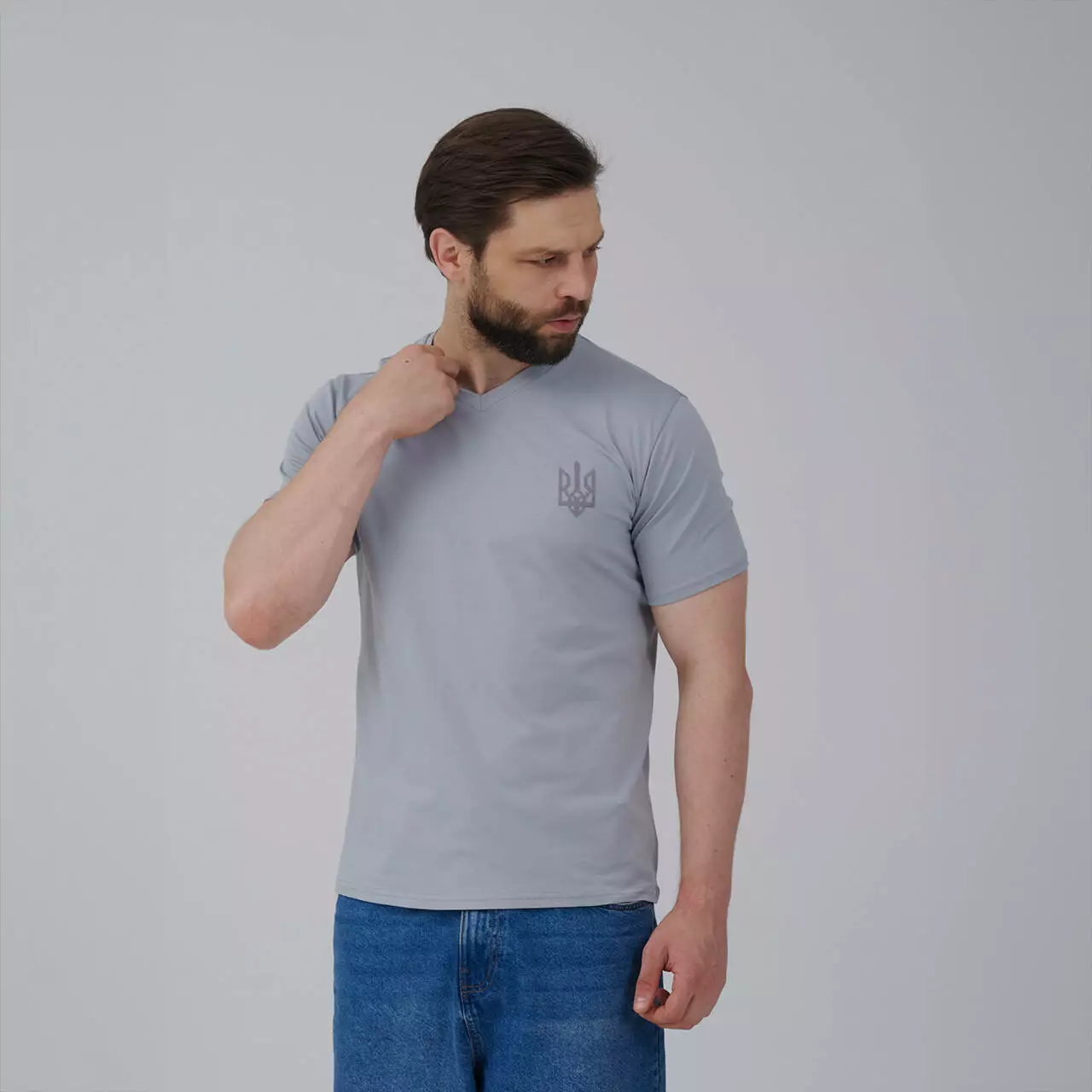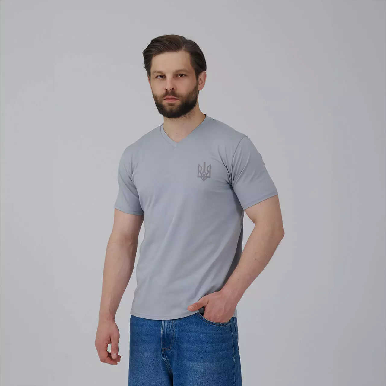 Футб сіра чоловіча з V-вирізом "Тризуб" темно-сіра вишивка