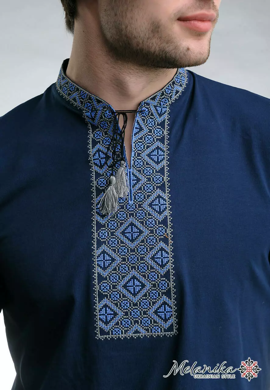 Сорочка вироблена із бавовни високої якості. Блакитні та сині нитки створили українську символіку на темно-синій тканині. На фото Ви можете ближче переглянути візерунок, який витканий за допомогою машинної техніки. Унікальне вбрання, яке повинно бути у Вашому гардеробі!