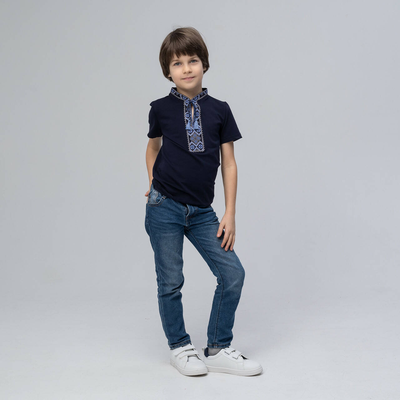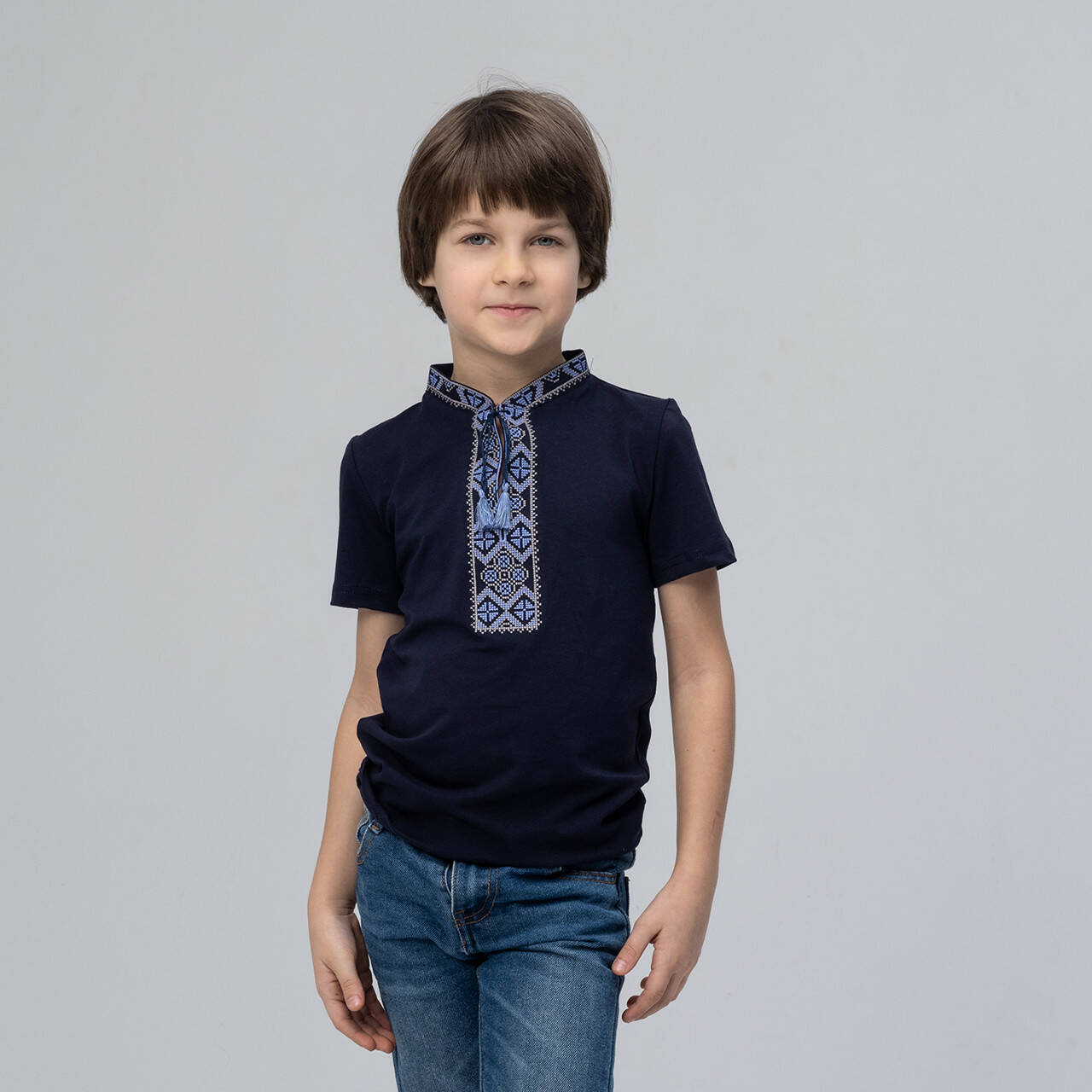 Класична дитяча футболка з вишивкою «Козацька (синя вишивка)» 92