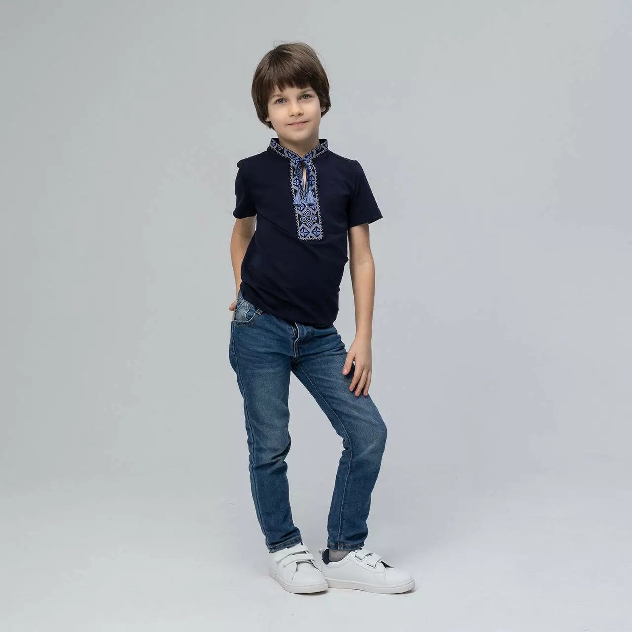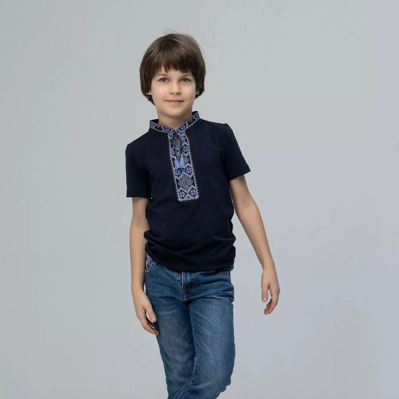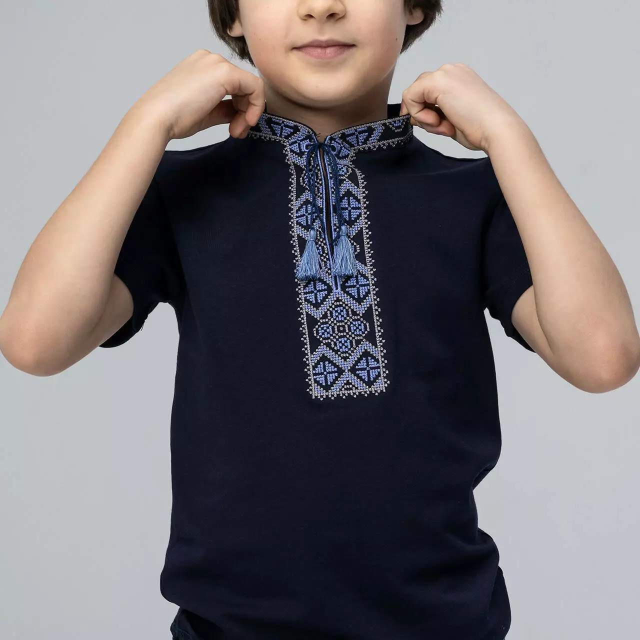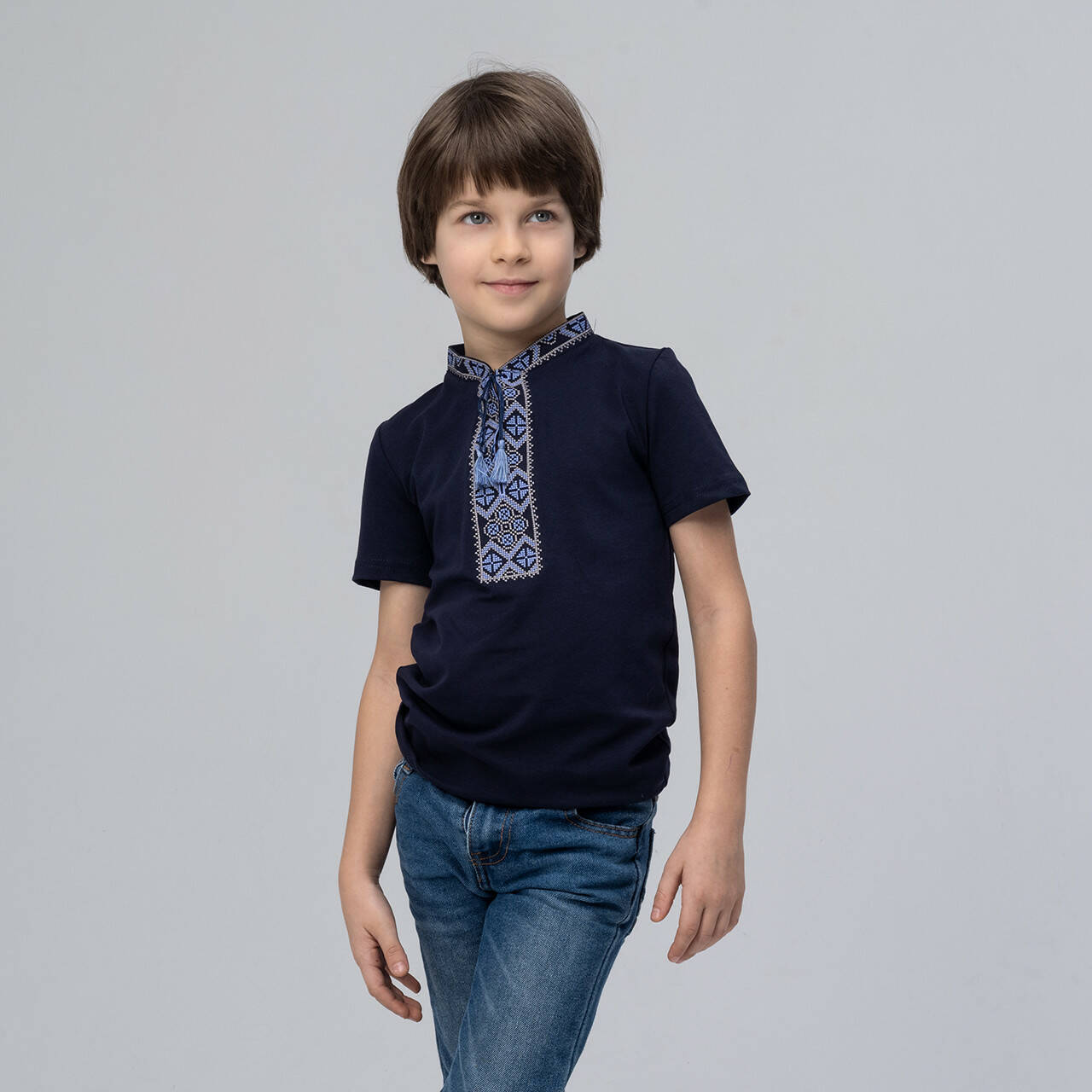 Класична вишита футболка темно-синього кольору з синьою вишивкою "Козацька". Виготовлена з натуральної бавовни, яка ніжна та приємна на дотик, освіжить від спекотних промінчиків сонця. Оздоблена кутасиками та синім візерунком на футболці, яка сімволізує небо та воду ( визволення від недуг та душевного спокою). Вишивка синіми нитками найчастіше присутня на чоловічих, дитячих вишиванках, оскільки захищають від небезпек та хвороб. Класична вишита футболка в українському стилі прикрасити хлопчика та зробить його образ шикарним. Поспішайте придбати класичні вишиванки для себе та своїх дітей у інтернет-магазині "Меланіка"!