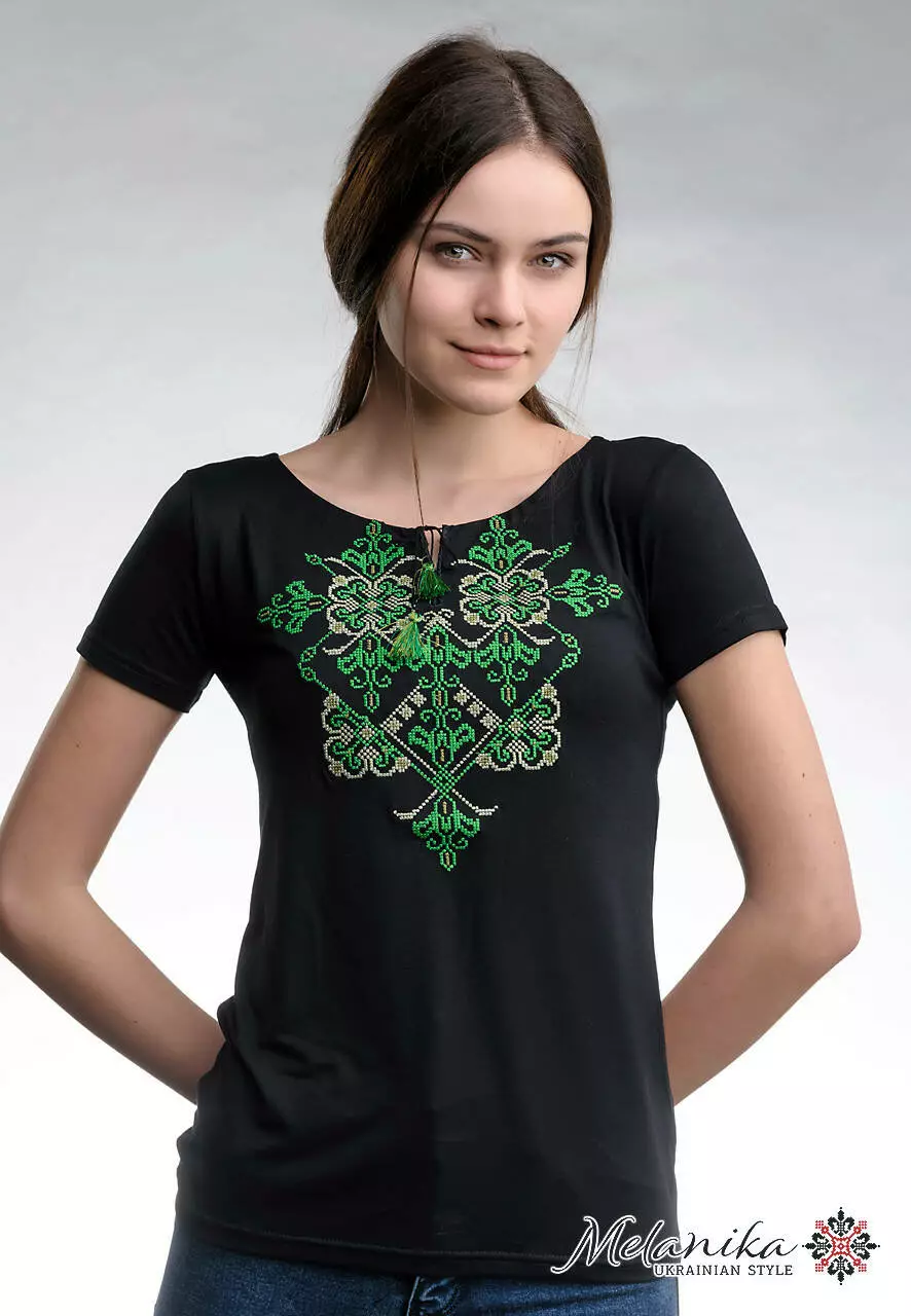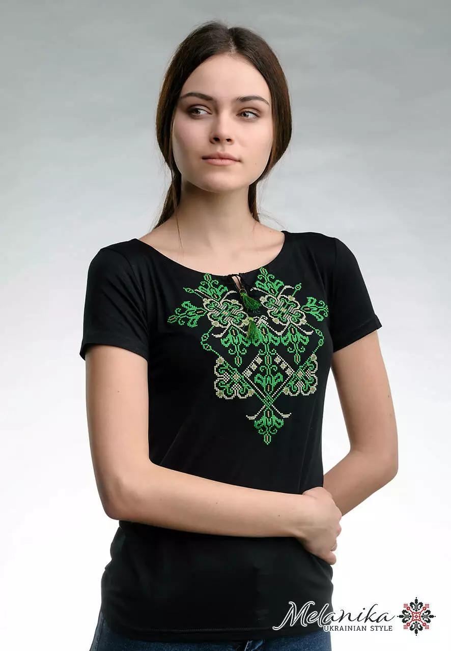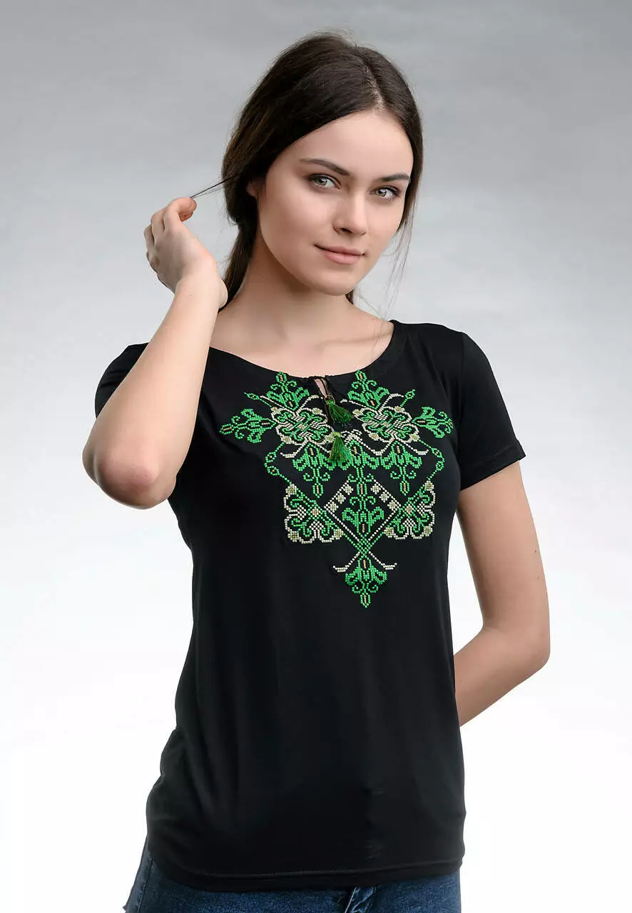 Практична та ошатна чорна вишита футболка із яскравою зеленою вишивкою розміщеною на грудях. Вишивка виконана у традиційному українському стилі. Така модель футболки підійде як для щоденного використання так і для урочистих заходів на державному рівні. З цією моделлю ви зможете комбінувати та створювати власні патріотичні образи із джинсами, шортами та спідницями. Футболка підкреслить жіночність та витонченість форм, подарує відчуття комфортної легкості.