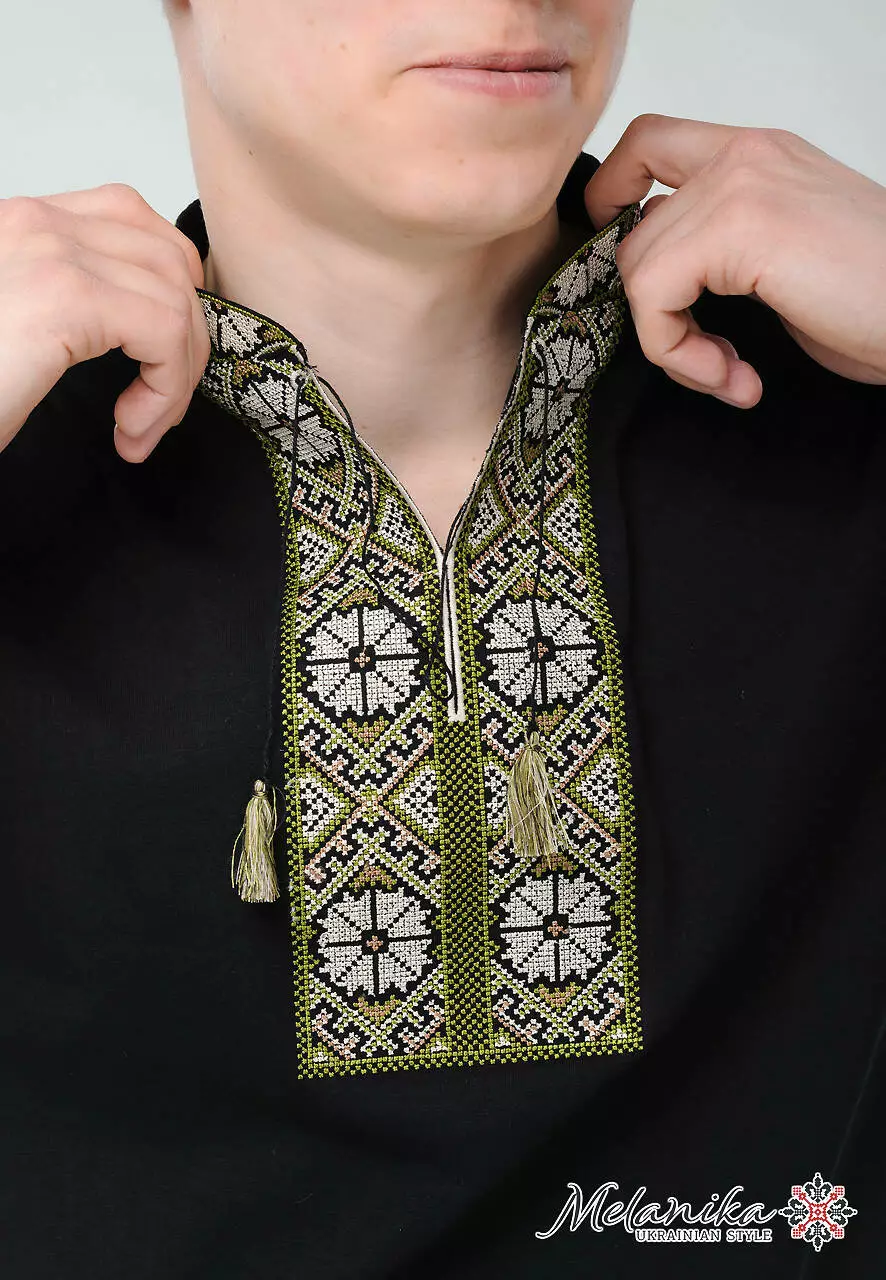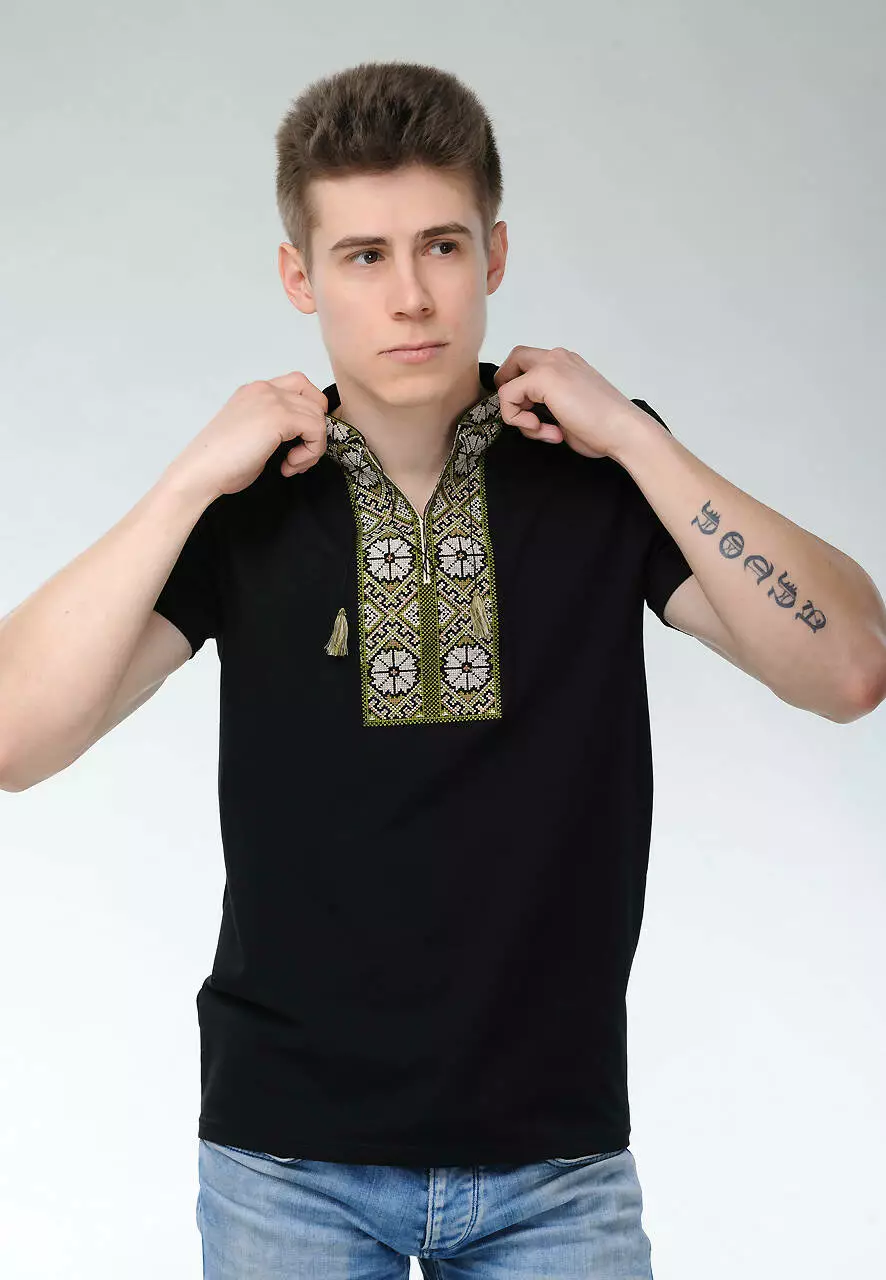 Модна чоловіча вишита футболка на короткий рукав в етнічному стилі «Гуцульська (зелена вишивка)»