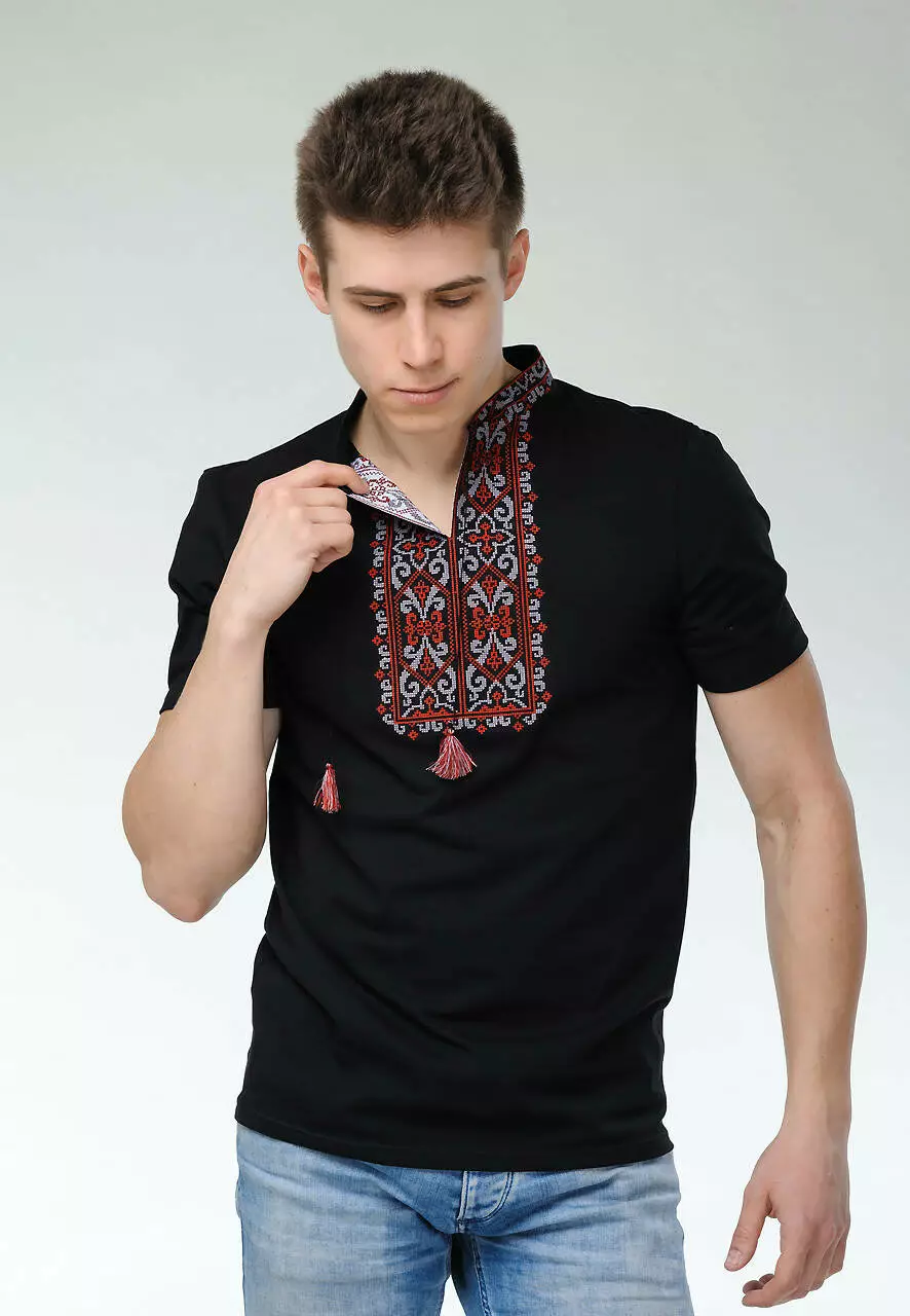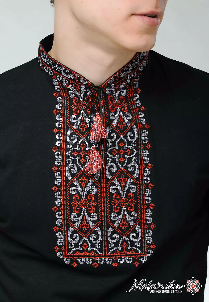 Зверніть увагу на контрастний орнамент, який прикрашає перед цієї моделі. Домінуючі вишневі нитки витворили абсолютну геометричну гармонію. Візерунок дуже гарно виглядає на чорному тлі основної тканини.