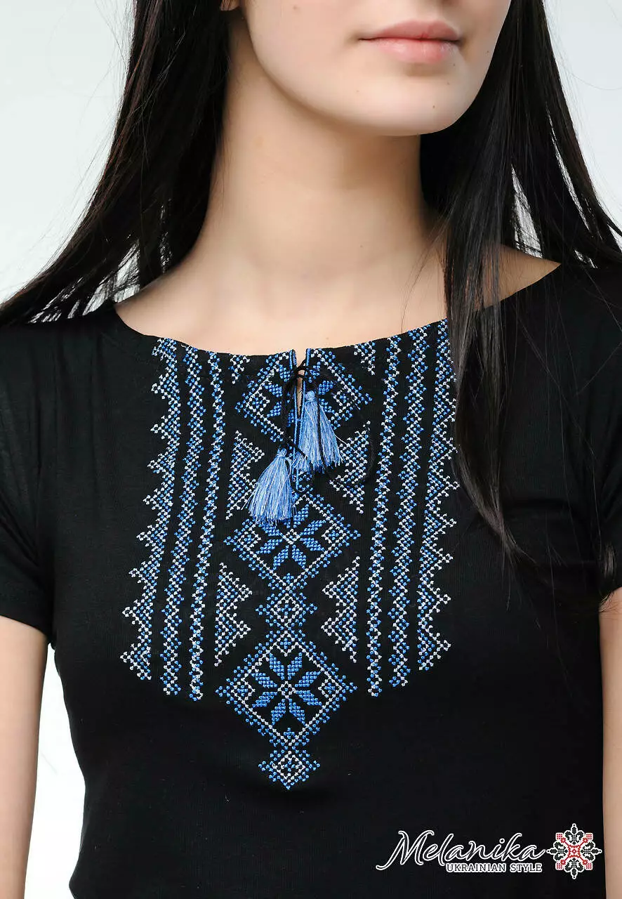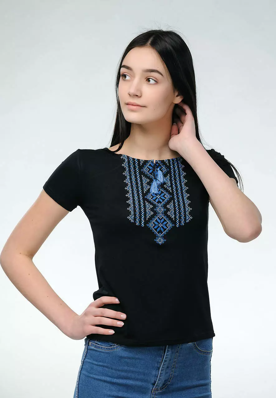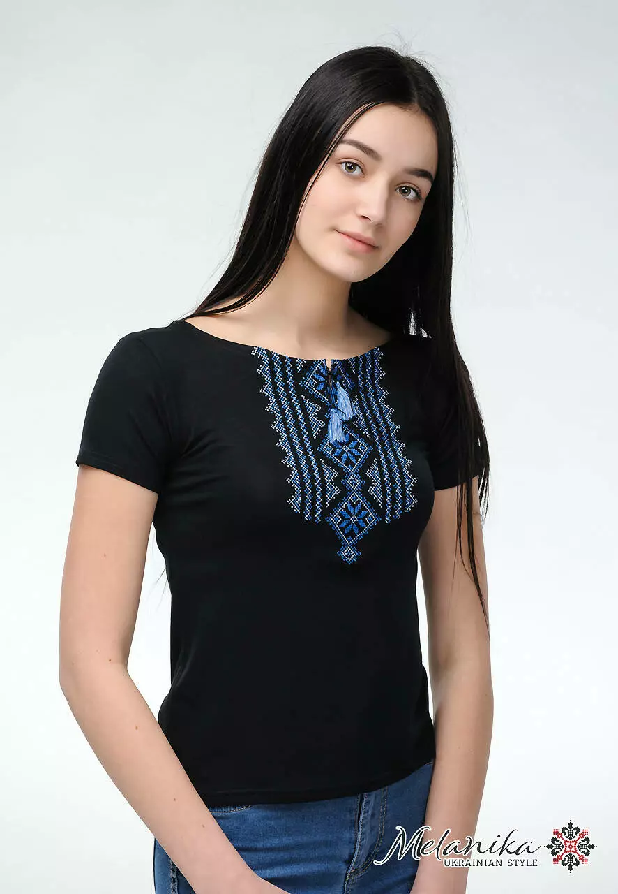 Ви будете вражені неймовірною легкістю та красою цієї жіночої вишитої футболки на короткий рукав. "Гуцулка" - ідеальна вишиванка на будні та свята, адже в ній поєднано найкращі традиції української вишиванки. Вишитий орнамент стриманий та чіткий. Ви можете побачити та навіть відчути кожен стібок. Тип нанесення вишивки - машинна вишивка. Для того, аби візерунок вийшов якомога ефектнішим, колористи вирішили зробити його білі синім.