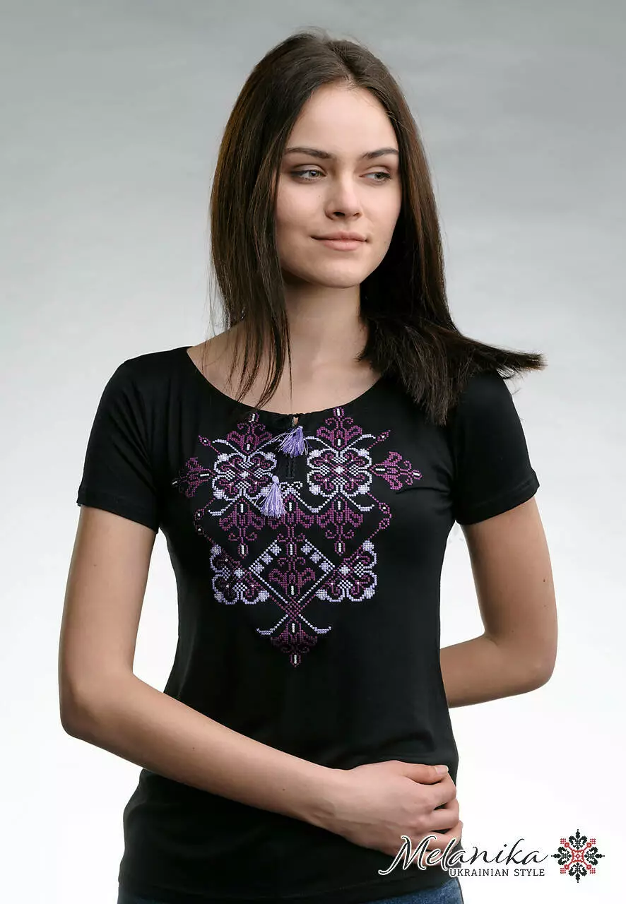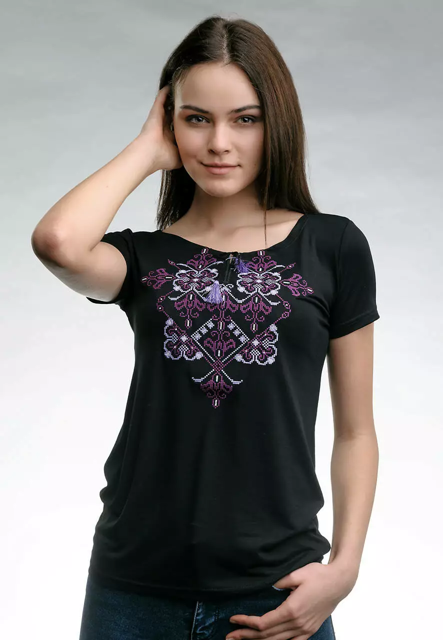 Жіноча вишита футболка Елегія - це не просто типова річ, це вибух кольорів, які створюють коктейль емоцій. Яскравий фіолетовий орнамент красиво відтіняється на чорній тканині, тим самим створюючи ефектне довершене поєднання. Модель вишитої футболки універсальна і поєднується із будь-яким одягом. Кожен ваш образ із цією футболкою буде абсолютно іншим, і буде викликати абсолютно різні емоції. Джинси, шорти чи щось інше - це все буде доречно поєднуватися із цією футболкою. Окрім того, що модель красива, вона і практична, адже виготовлена із високоякісної тканини, яка не приємна на дотик, не мнеться та чудово пропускає повітря.