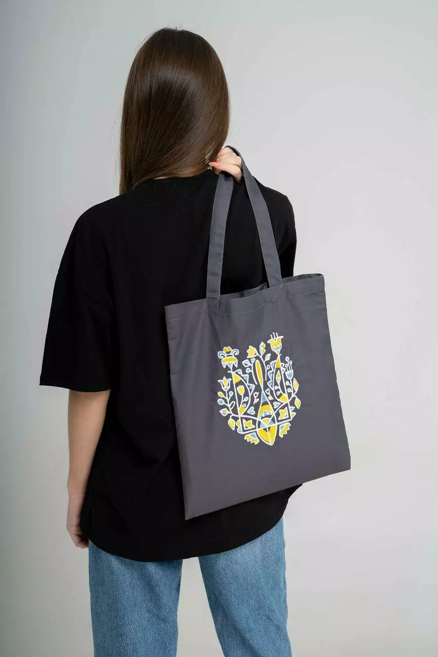 Стильна еко сумка-торба з бавовни з патріотичною вишивкою на графітовомо фоні.. Оригінальна упаковка для подарунків та для використання у повсякденному житті. Сумка прикрашена квітковим орнаментом, який витончено формується у великий тризуб.