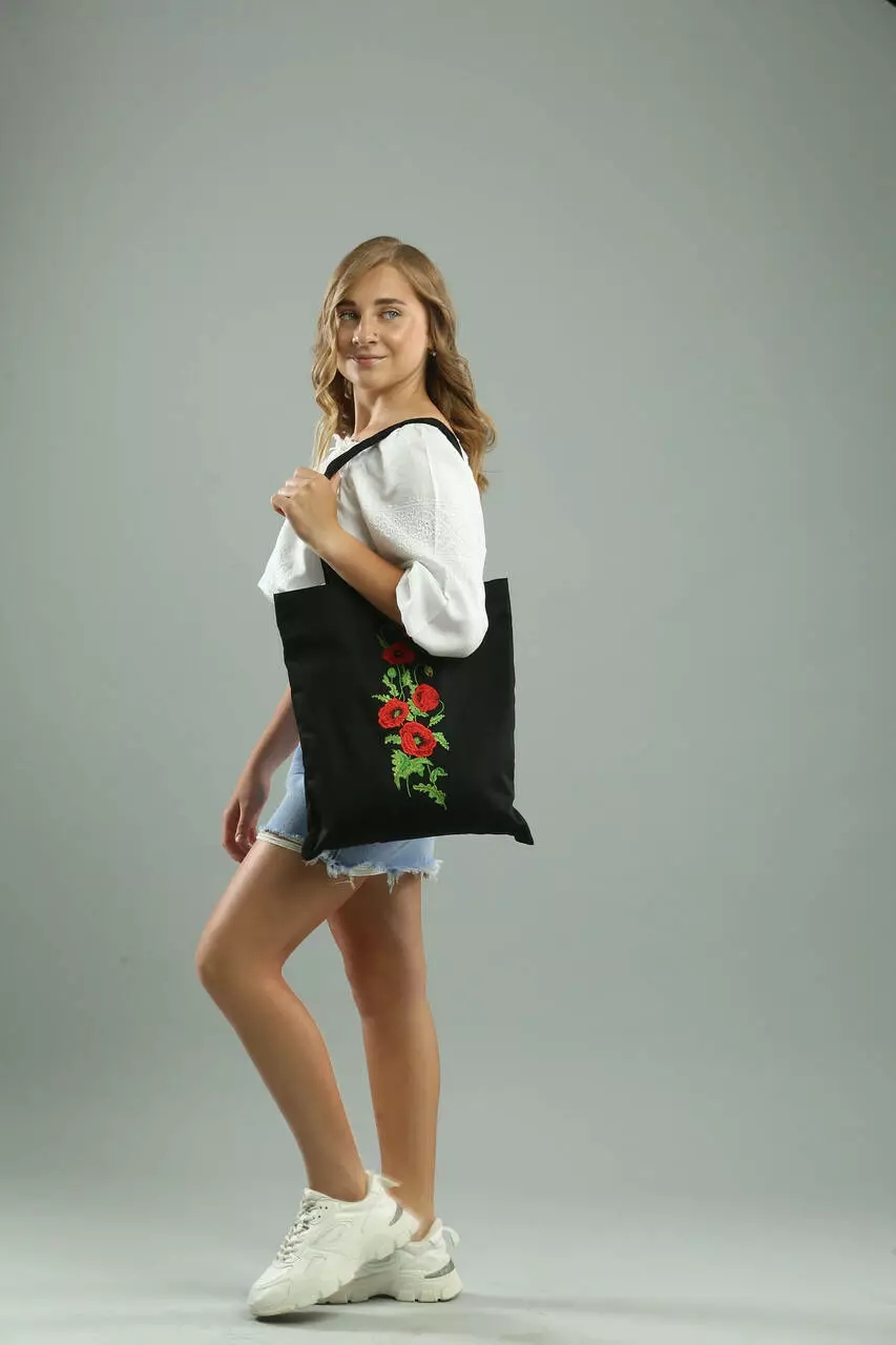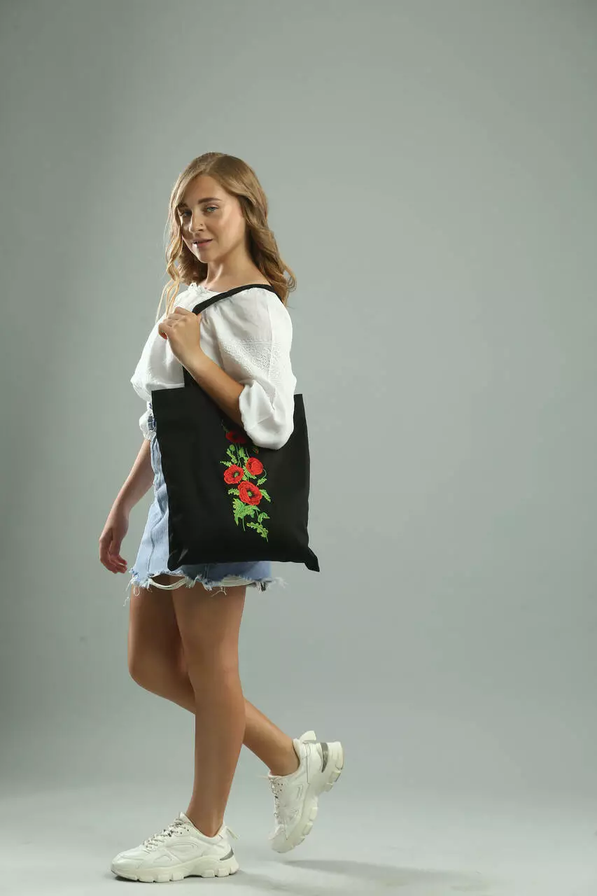 Повсякденна еко-сумка з вишивкою "Маки" у чорному кольорі.