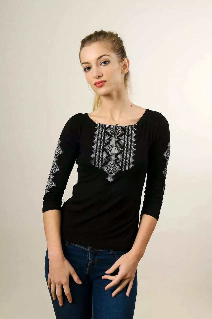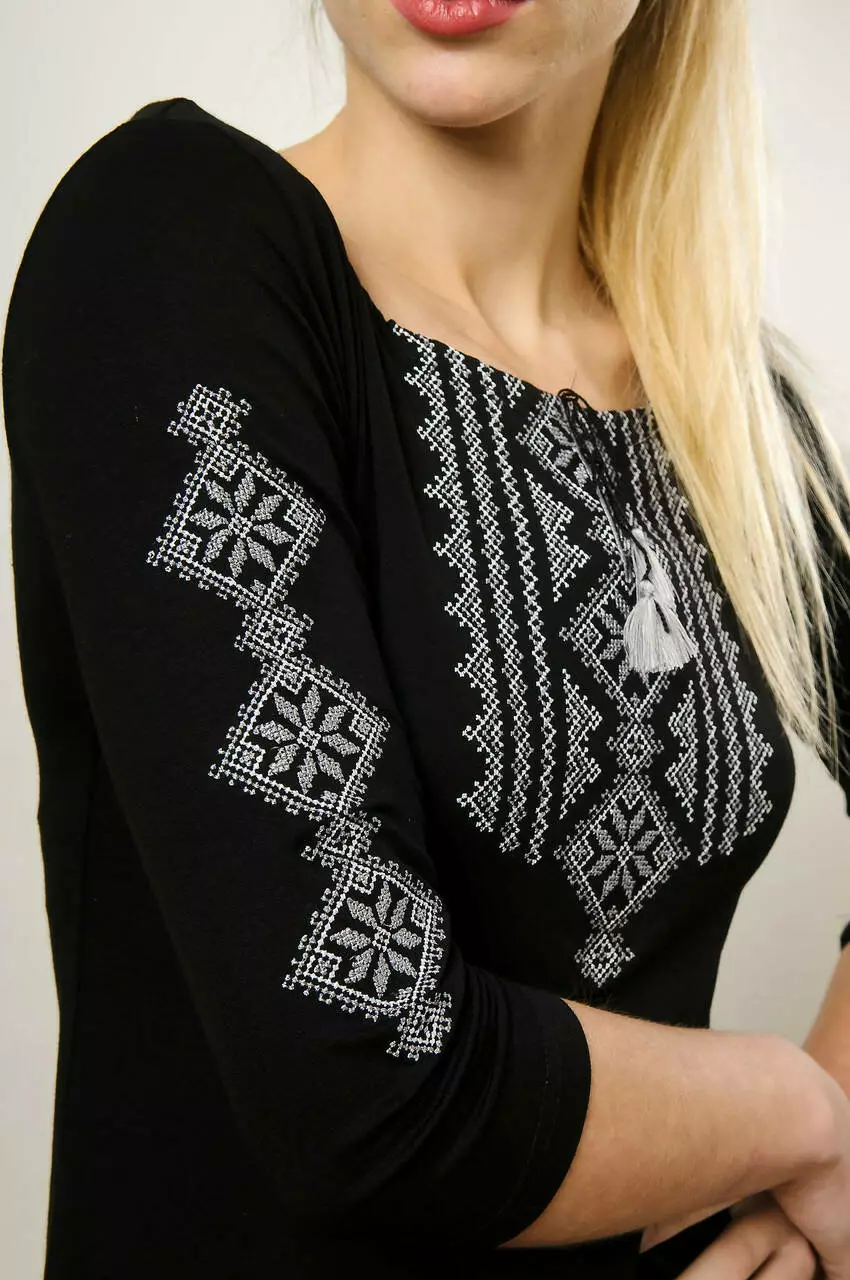 Сучасна жіноча вишита футболка у мінімалістичному стилі - це ідеальне рішення для створення вашого патріотичного образу. Модель є універсальною, адже підійде для використання на будь-яку подію, або ж на кожен день. Насичено чорна тканина та сіра вишивка - це феєрія почуттів, стриманості, сили, руху і звичайно ж вишуканого смаку. Вишита футболка є дуже практичною адже виготовлена із еластину та віскози, і тому чудово тримає форму та не мнеться. Прямий крій футболки підкреслює осину фігуру та дозволяє комбінувати футболку із будь-яким іншим одягом в стилі casual. Ця модель вам точно сподобається. Носіть УКРАЇНСЬКЕ.