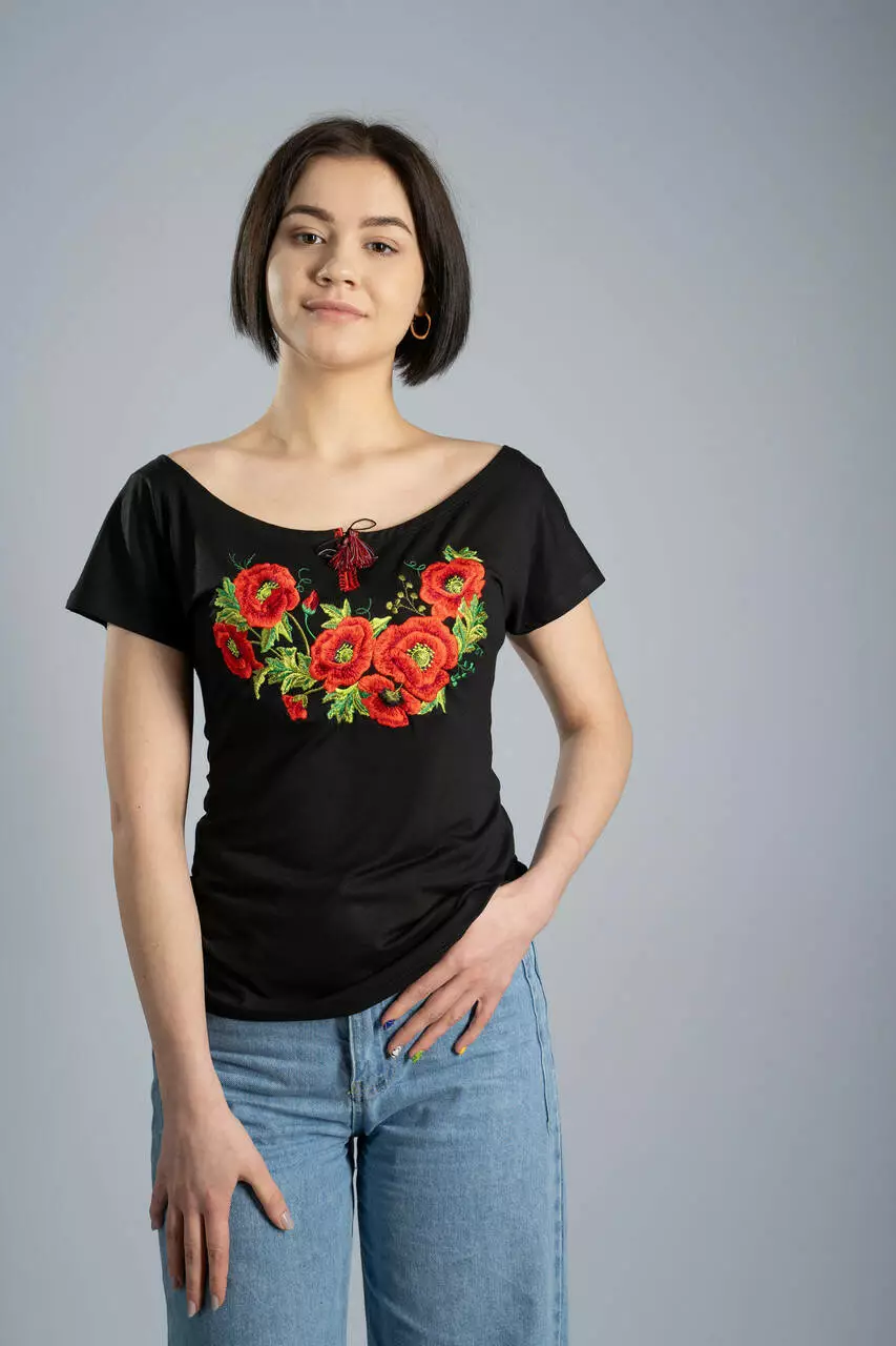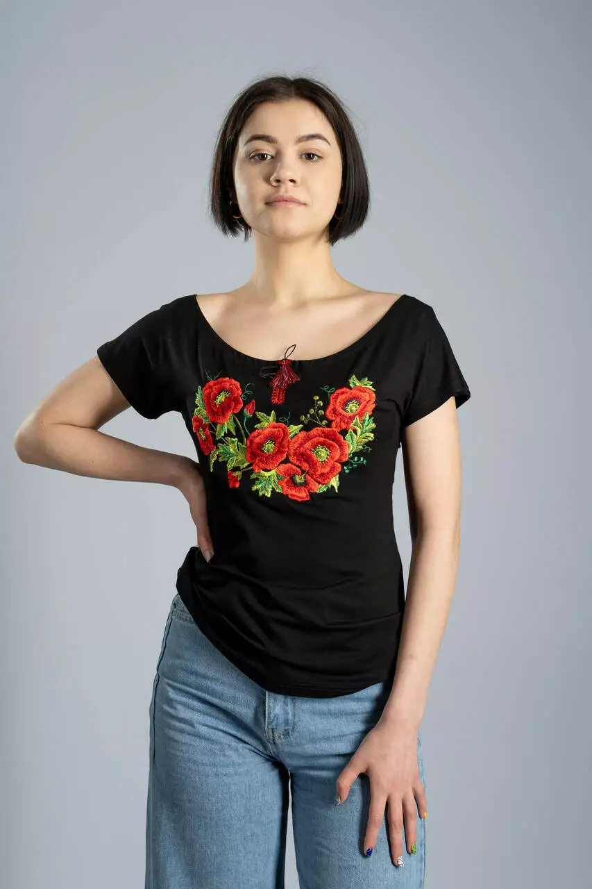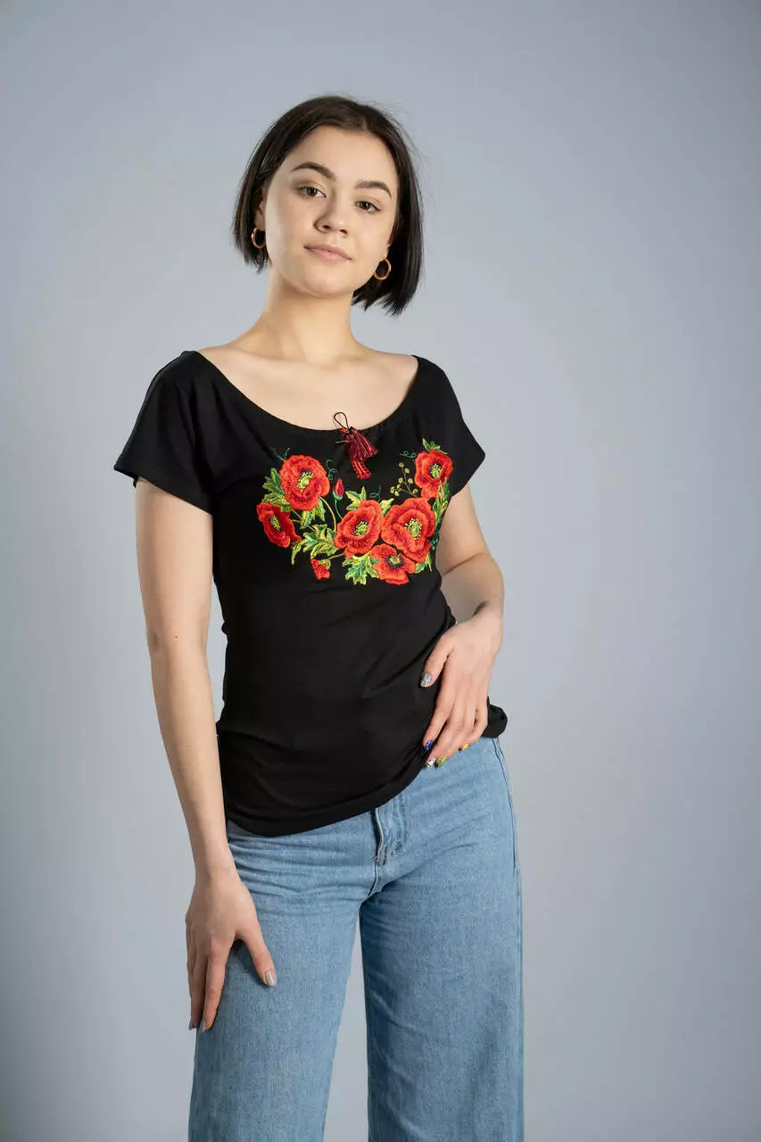 Стильна жіноча вишита футболка у чорному кольорі з круглим вирізом "Маки"