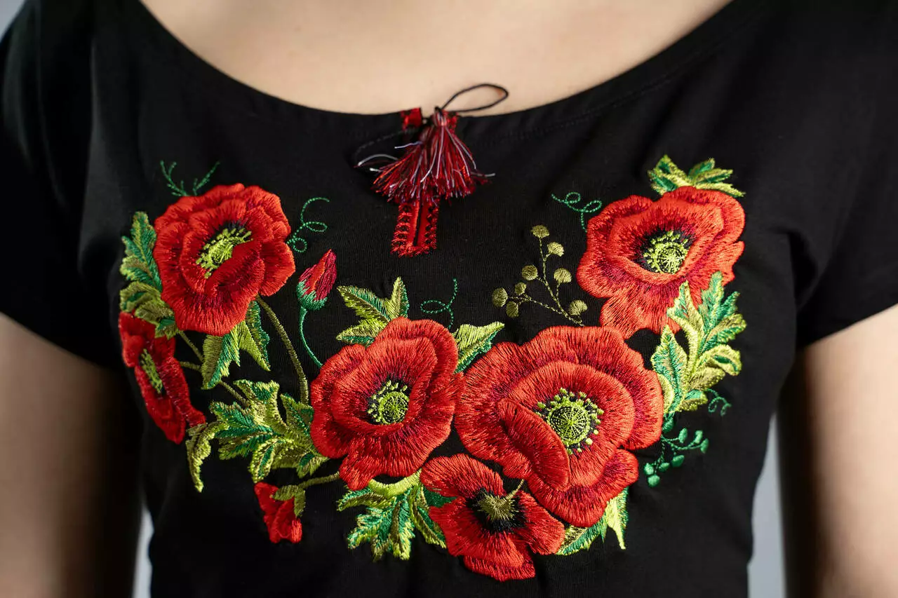 Тканина для цієї вишитої футболки дуже м’яка та приємна до тіла. Бавовна та еластан поєднані в цій тканині чорного кольору роблять її тягучою. Вона ніжно обгортає контури Вашого тіла, та дихає, що дуже важливо у спекотну пору року.