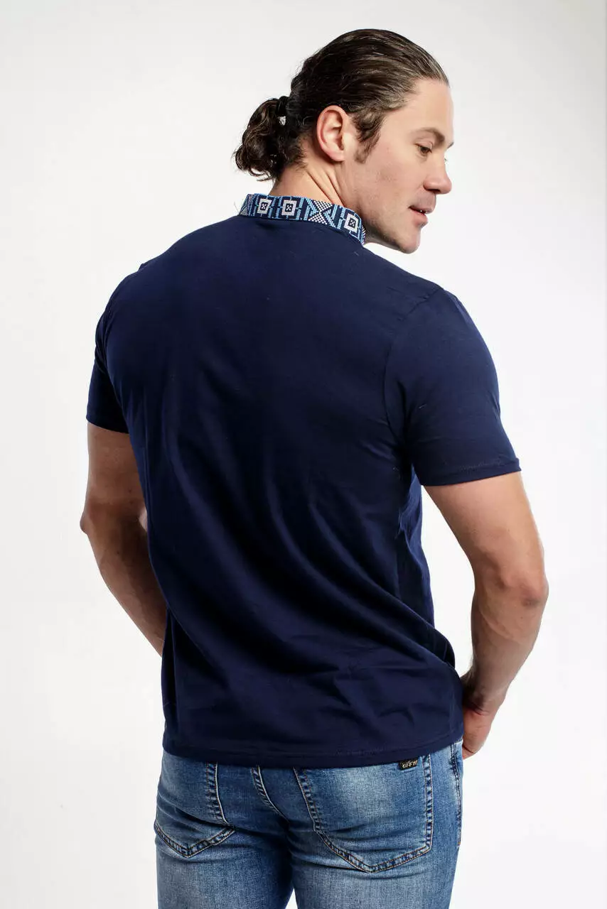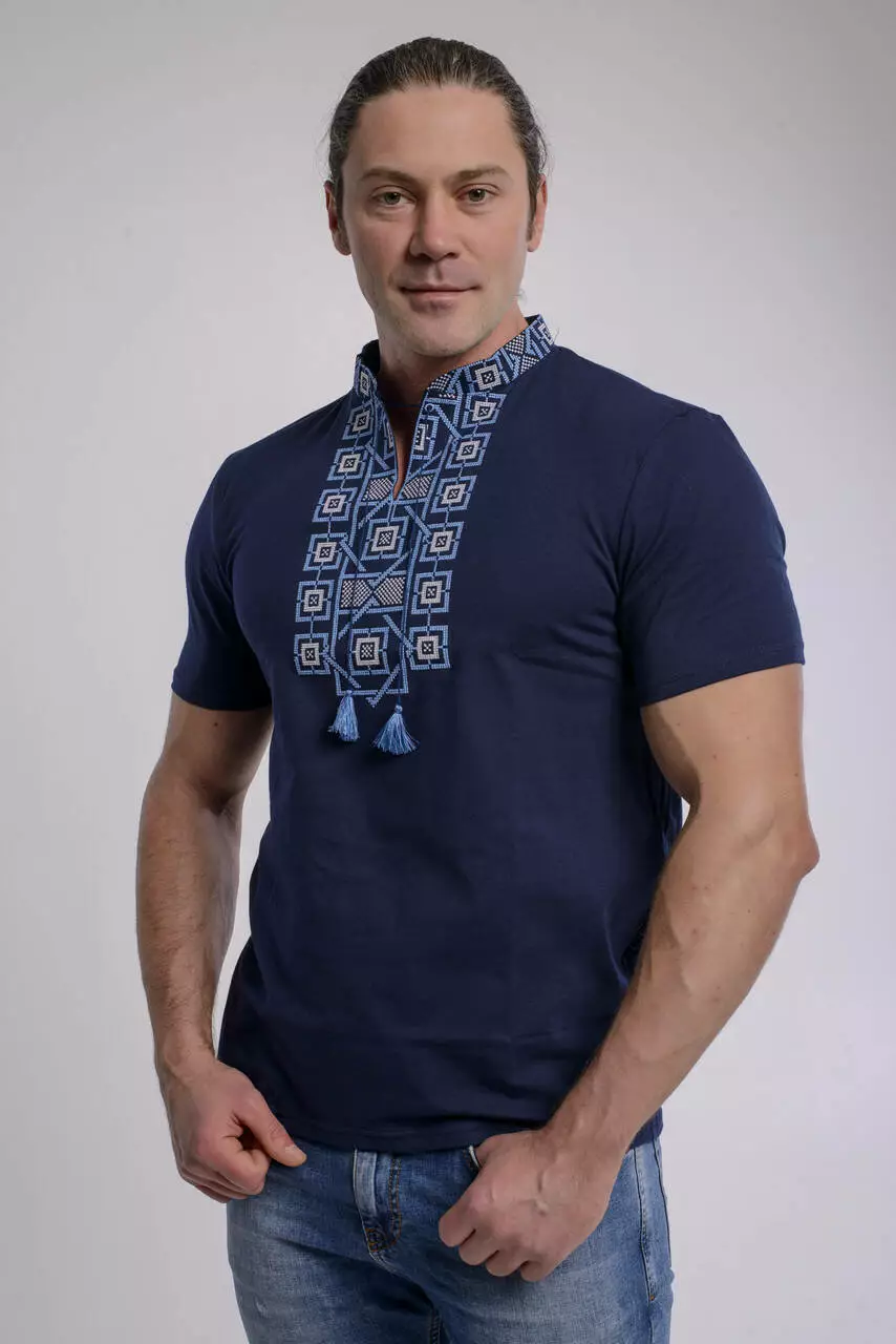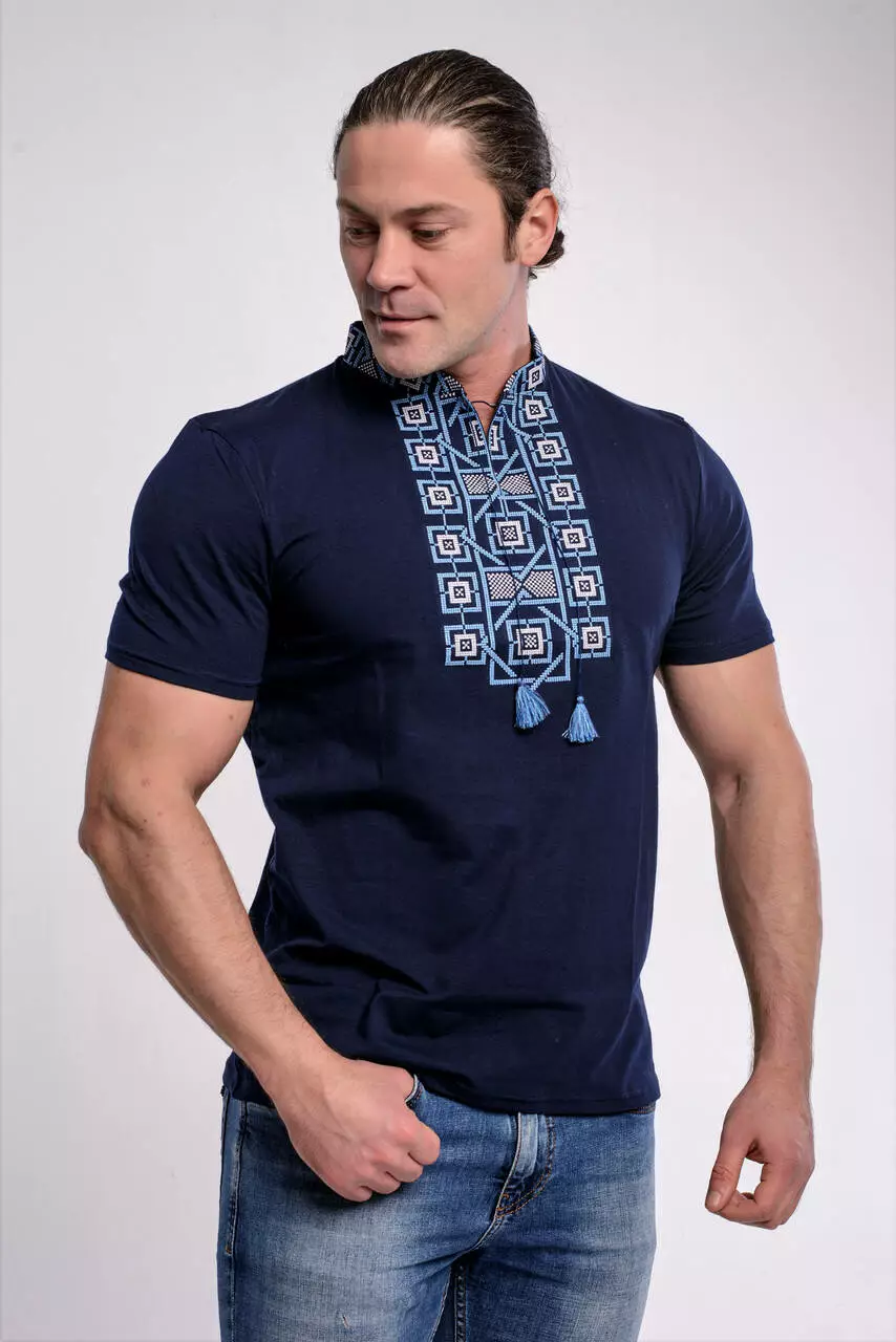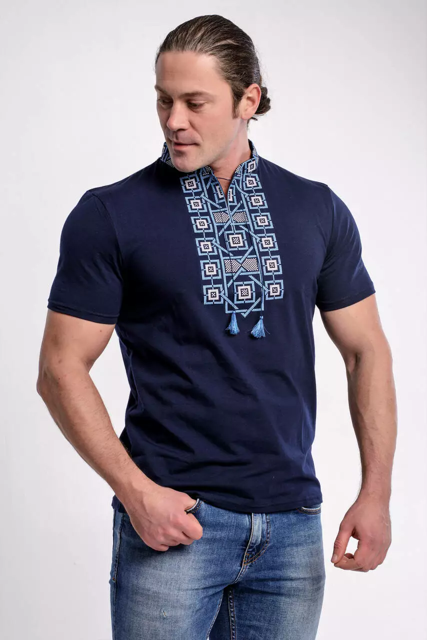 Блакитна вишивка у поєднані із темно-синім кольором футболки створює витончений образ на кожен день чи на улюблене свято. Матеріал виробу – високоякісна бавовна. Техніка машинної вишивки. На фото Ви можете переглянути наскільки деталізовано розроблено візерунок.