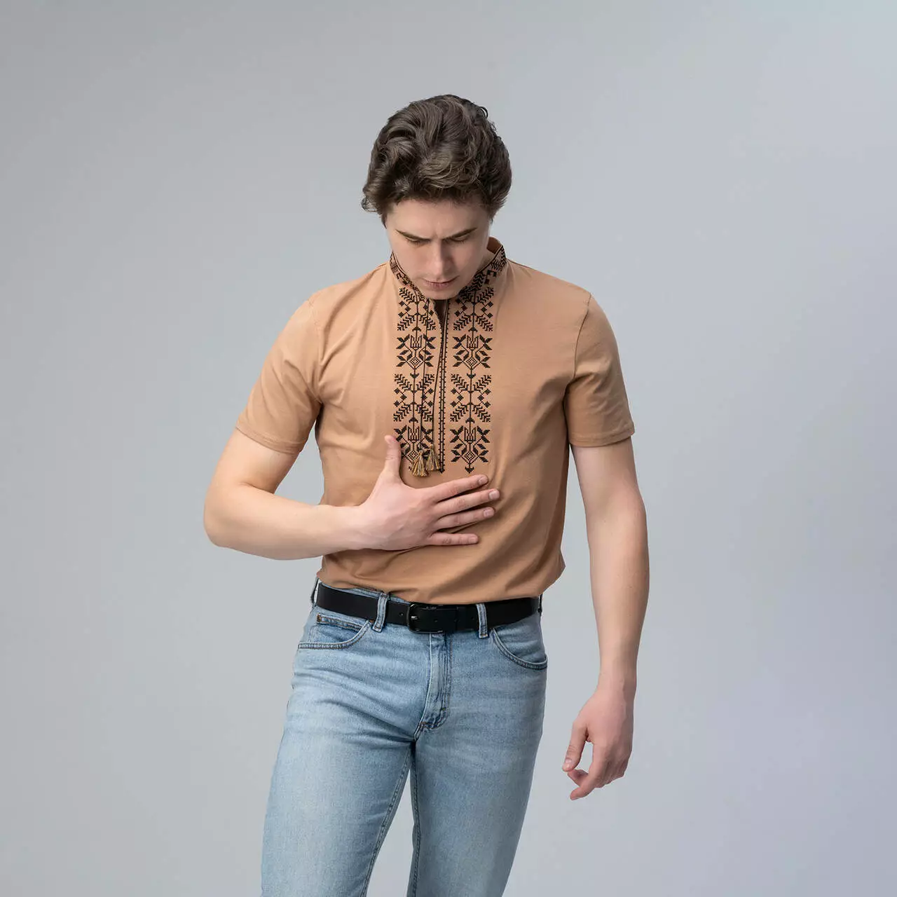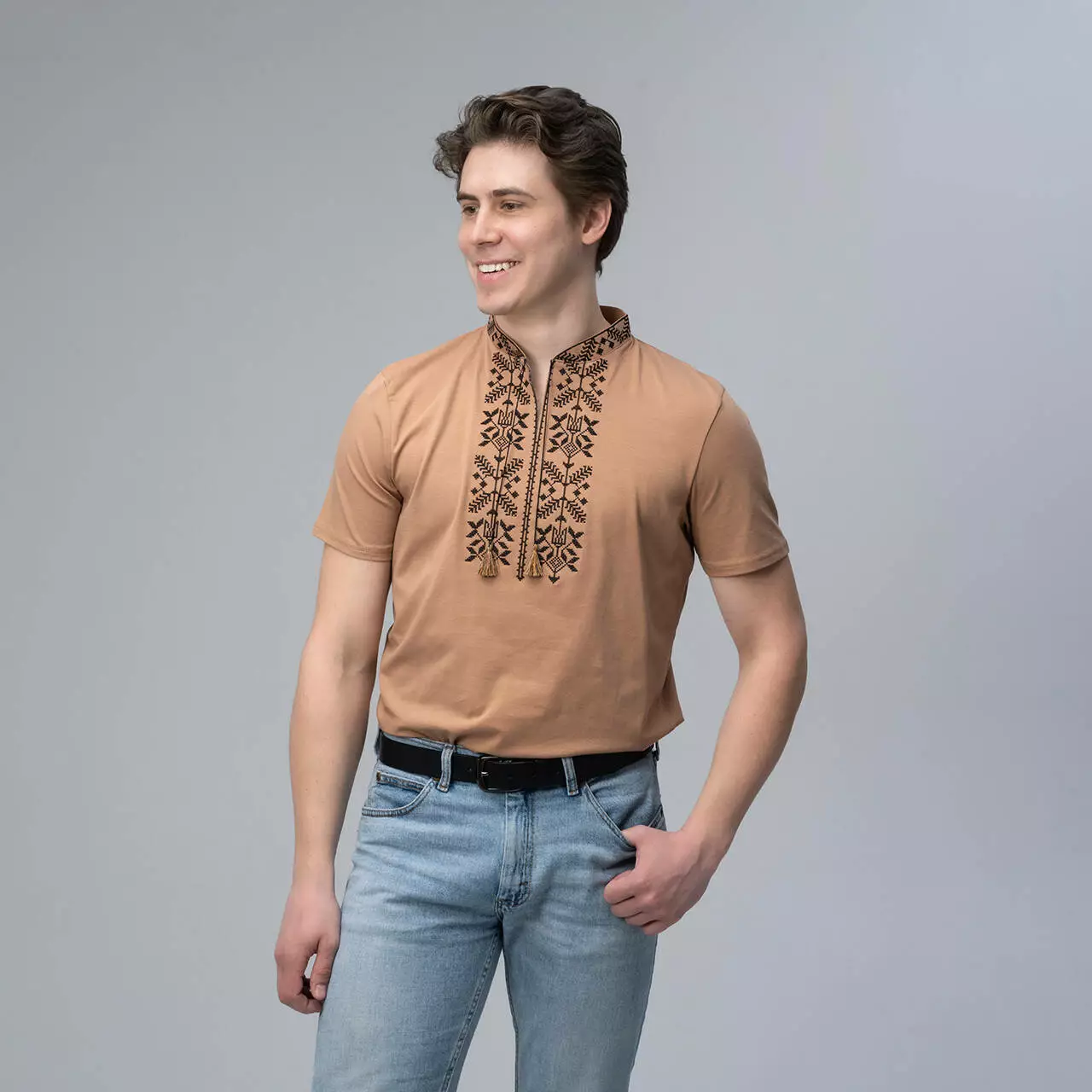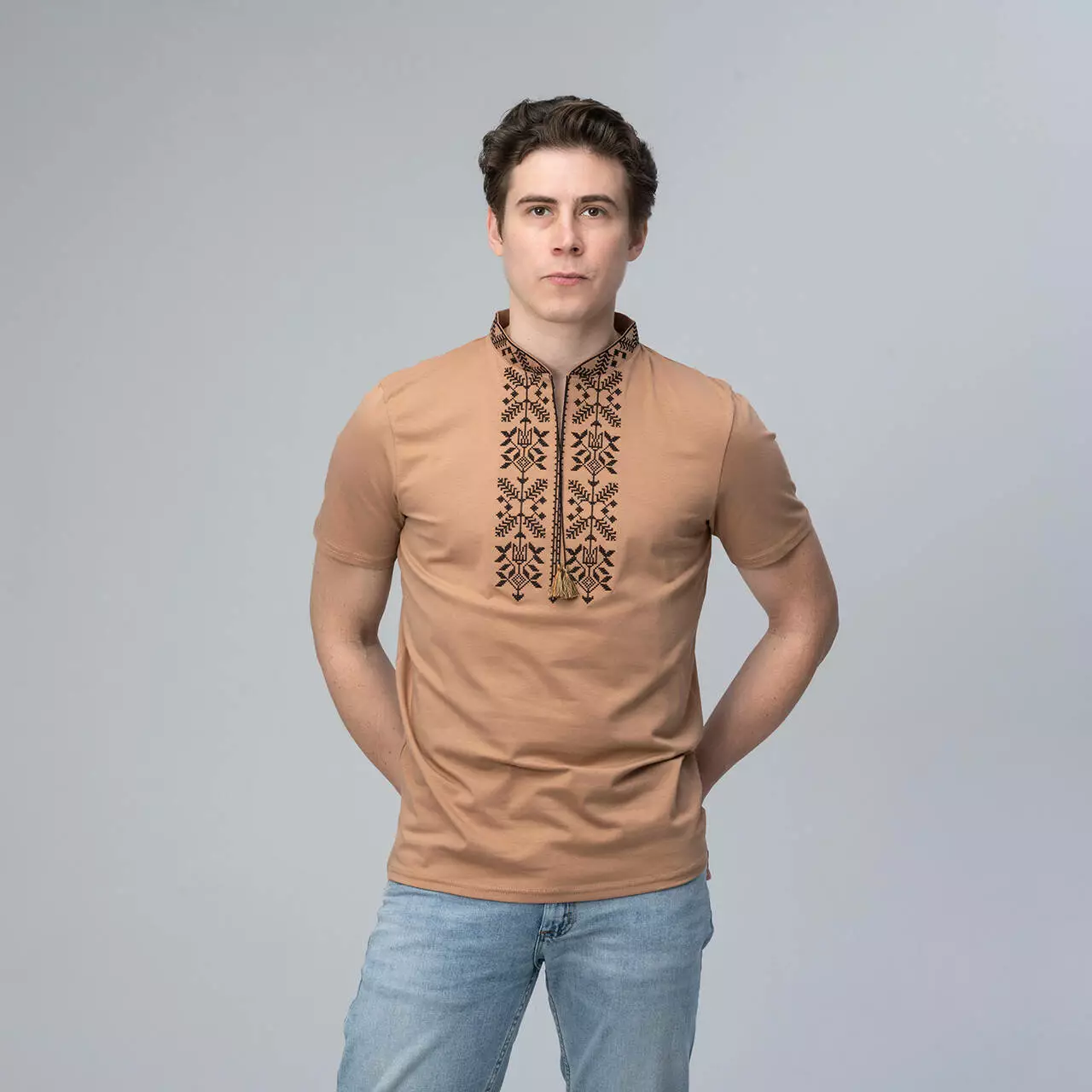 Бежева чоловіча футболка з вишивкою "Тризуб" - це модель, яка здивує вас своїм кольором. Ви подумаєте, що таого може бути у бежевому кольорі, а відповідь проста, це настільки унікальний бежевий колір, що ви його назавжди запам'ятаєте, і цей колір видно здалеку. На фоні цього кольору красується витончений чорний орнамент.