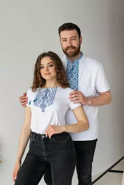 Дизайнери вибрали дуже гарний та водночас простий вишитий орнамент. Геометрична гуцульська композиція виглядає дуже ефектно та скоєно, поєднуючись з білосніжною тканиною. Вишивка наноситься машинним способом. Орнаменти виконані нитками глибокого синього кольору.