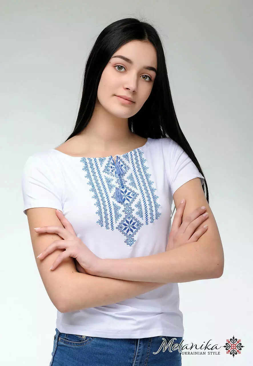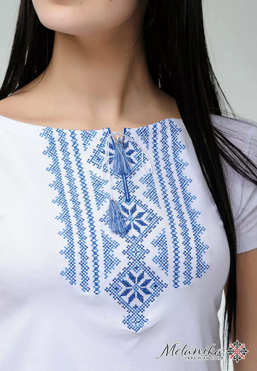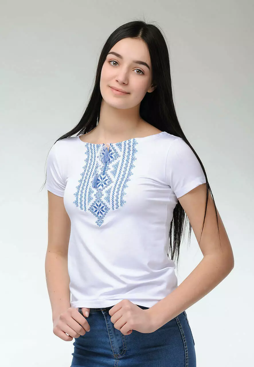 Вишита футболка для дівчини в білому кольорі із геометричним орнаментом «Гуцулка (блакитна вишивка)»