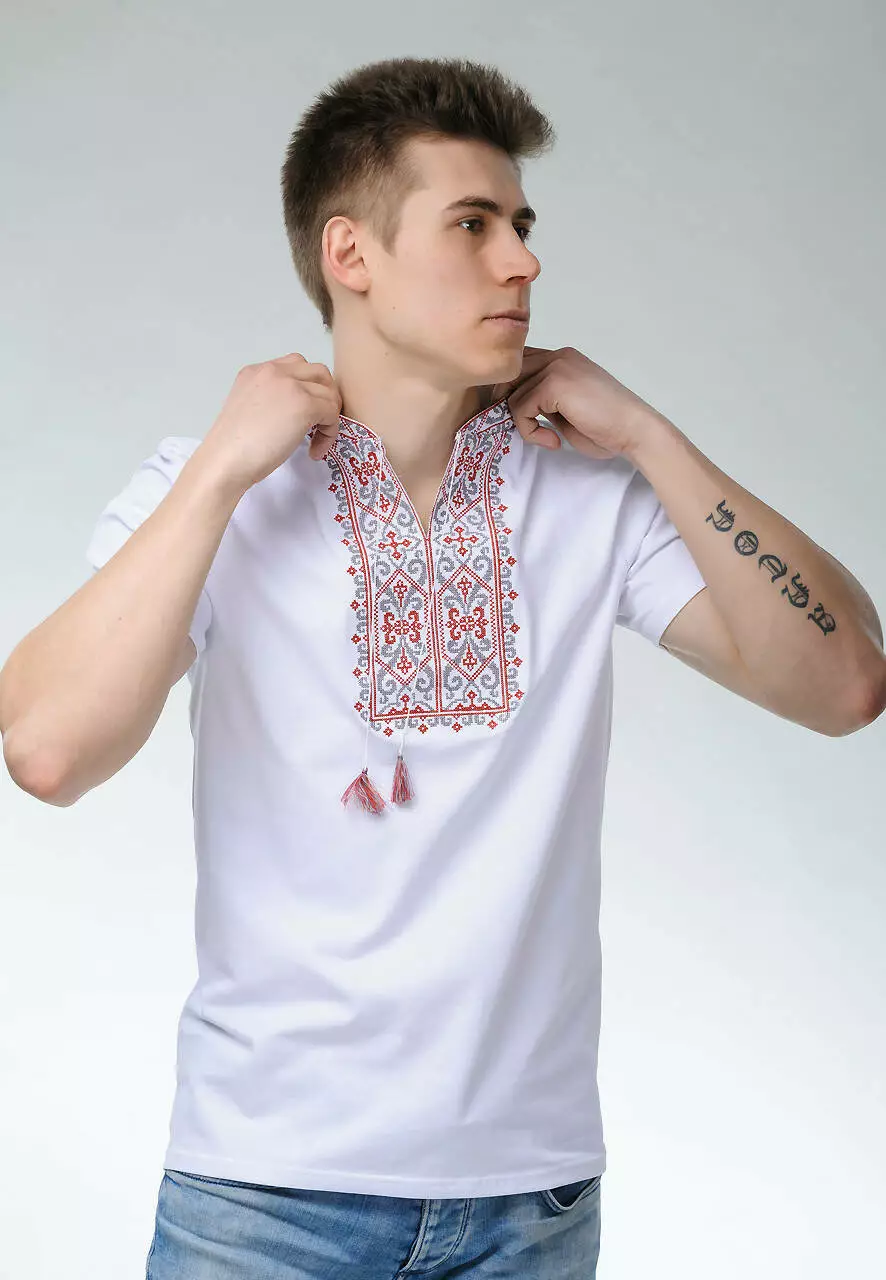Зверніть увагу на вишитий візерунок. Геометричний орнамент дуже гарно та гармонійно дивиться на білій тканині. Він виконаний вишневими нитками. Кожен стібок максимально рівномірний, тому не розповзеться при найменших ушкодженнях.