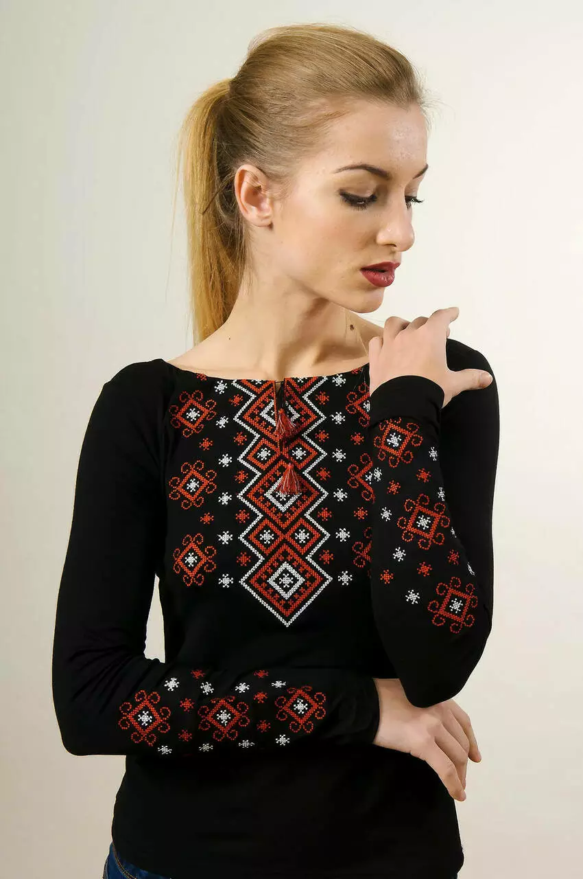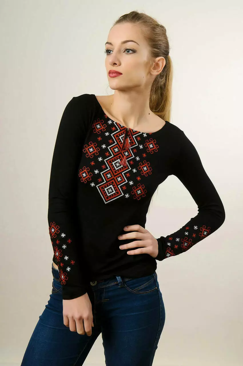 Ефектна та розкішна водночас вишита футболка на довгий рукав “Карпатський орнамент” личитиме практично кожній дівчині. Вишукана червоно-біла вишивка виконана технікою машинної вишивки. Таке поєднання кольорів робить геометричний орнамент дуже контрастним на фоні основної чорної тканини. Неймовірною вишитою красою прикрашені рукави та перед цієї моделі. особливого настрою додають яскраві кутасики на горловині.