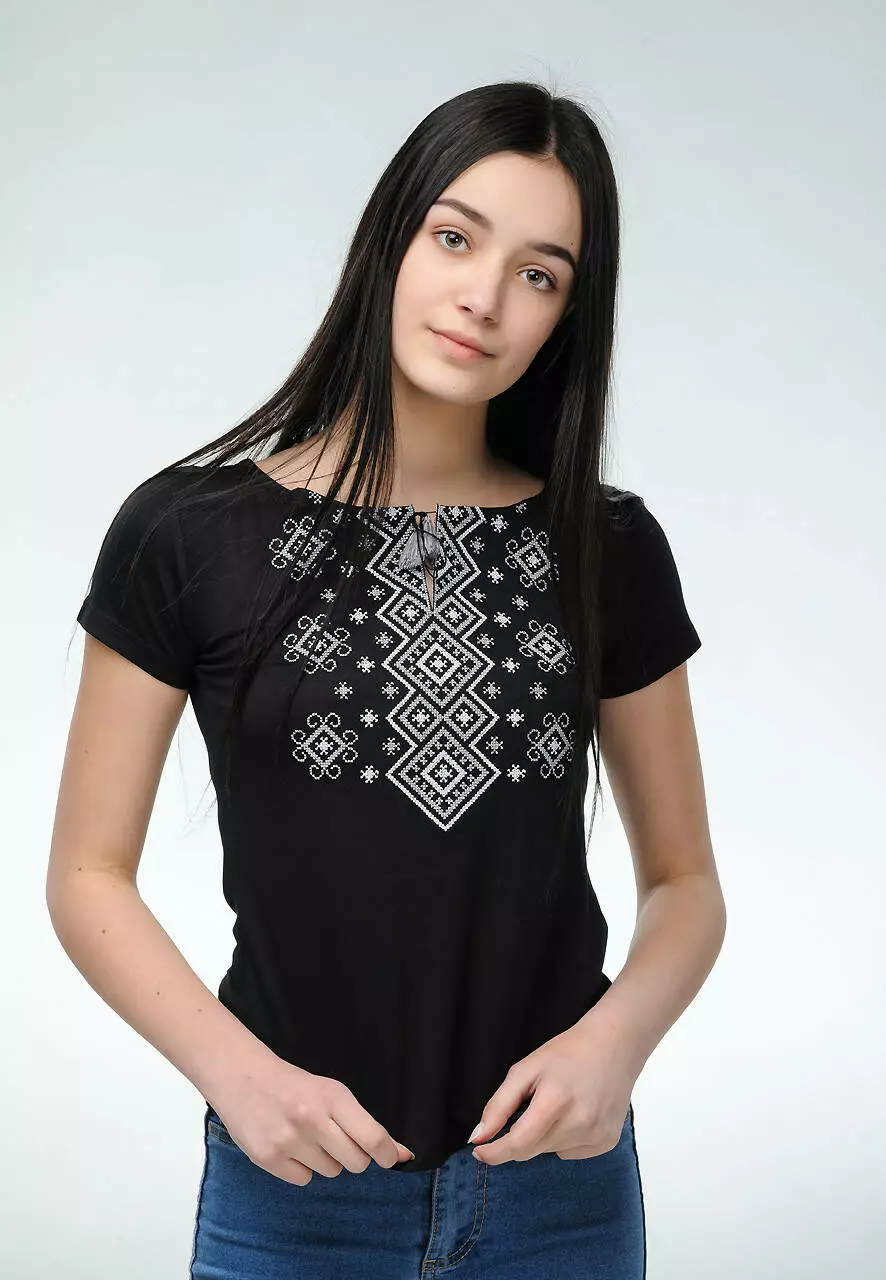 Дуже ніжний та водночас контрастний візерунок сірими нитками створює неповторну атмосферу цієї вишитої футболки. Вишитий візерунок нанесено технікою машинної вишивки. Геометрична композиція створена в найкращих традиціях гуцульської вишивки.