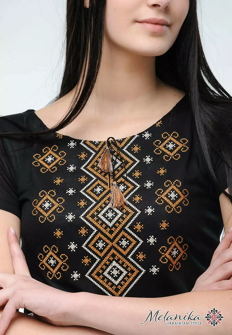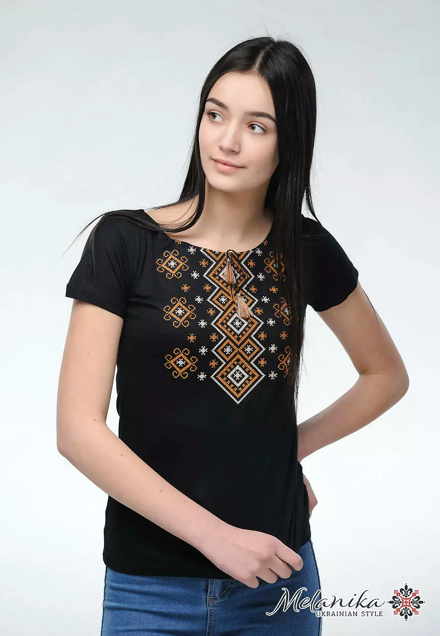 Жіноча вишита футболка на короткий рукав “Карпатський орнамент” чудово виглядає у поєднанні з речами класичного крою, а також з більш буденними варіантами луків. Віскозна тканина, що взята в основу цієї модної жіночої вишиванки, має глибокий чорний колір, який не вимивається. Тканина високої якості, тому не деформується після правильного режиму прання.