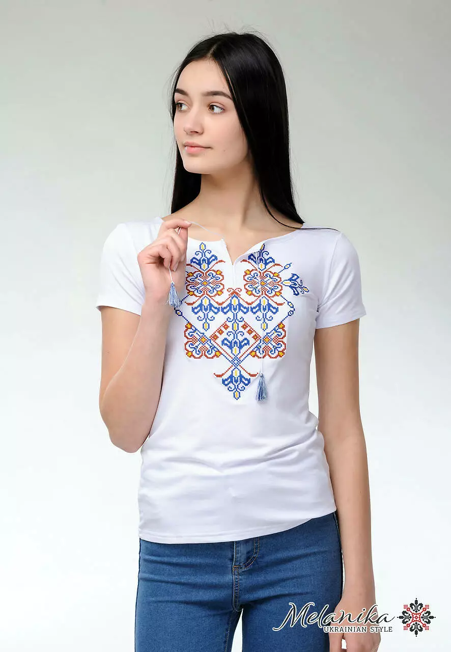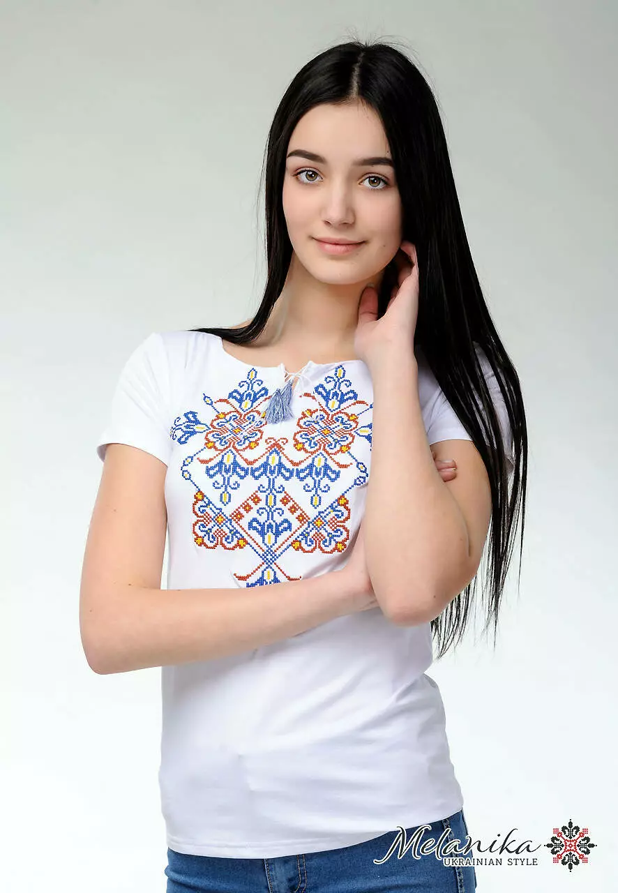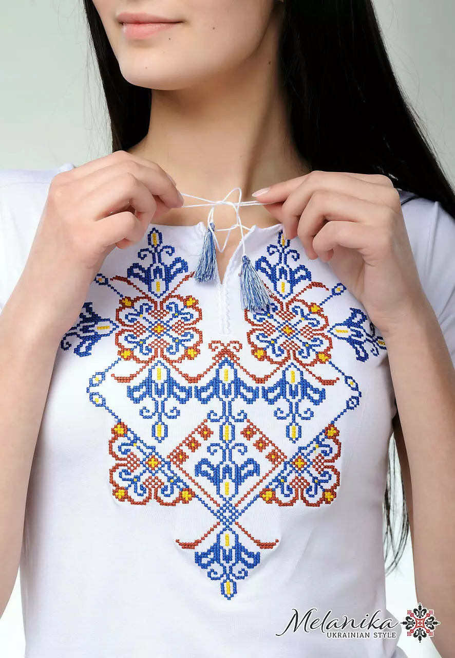 У цій вишуканій моделі майстри поєднали найкращі риси українського етнічного одягу. Білосніжна тканина чудово гармонує з вишитим візерунком. Особливу увагу приковує до себе незвичний пишний, але водночас простий вишитий орнамент. Він нанесений за допомогою техніки машинної вишивки. Дизайнери поєднали яскраві та більш спокійні кольори для створення цієї композиції. Домінантним є глибокій синій колір ниток. Геометрична композиція виглядає цілісно, але не перенасичено.