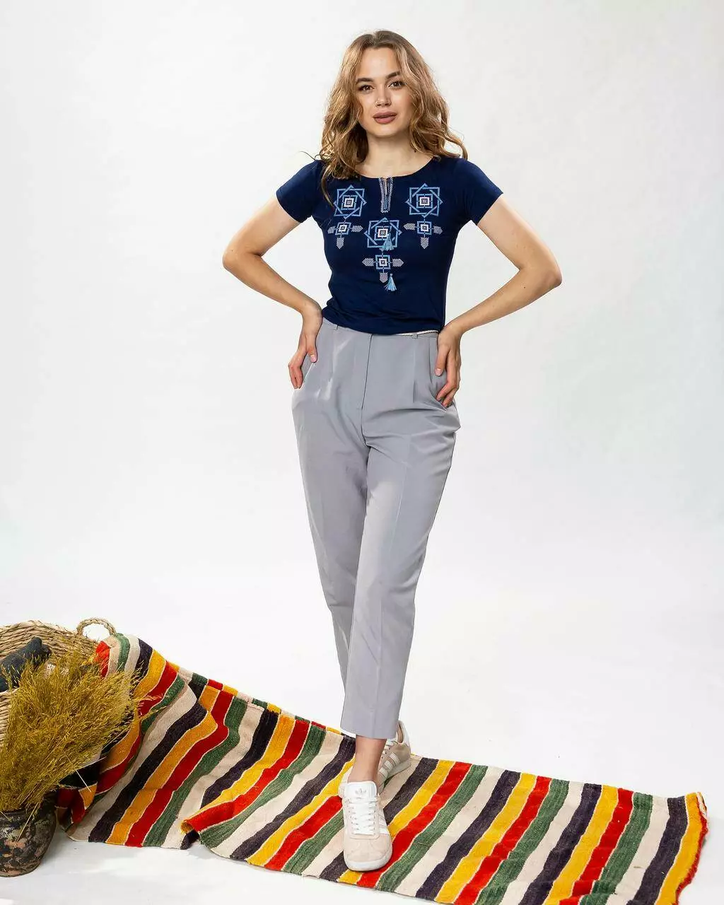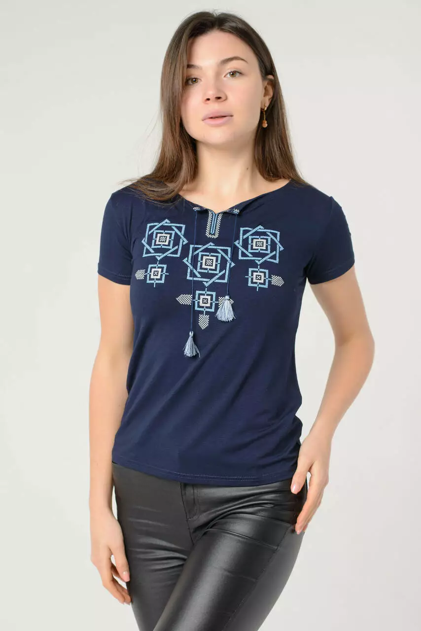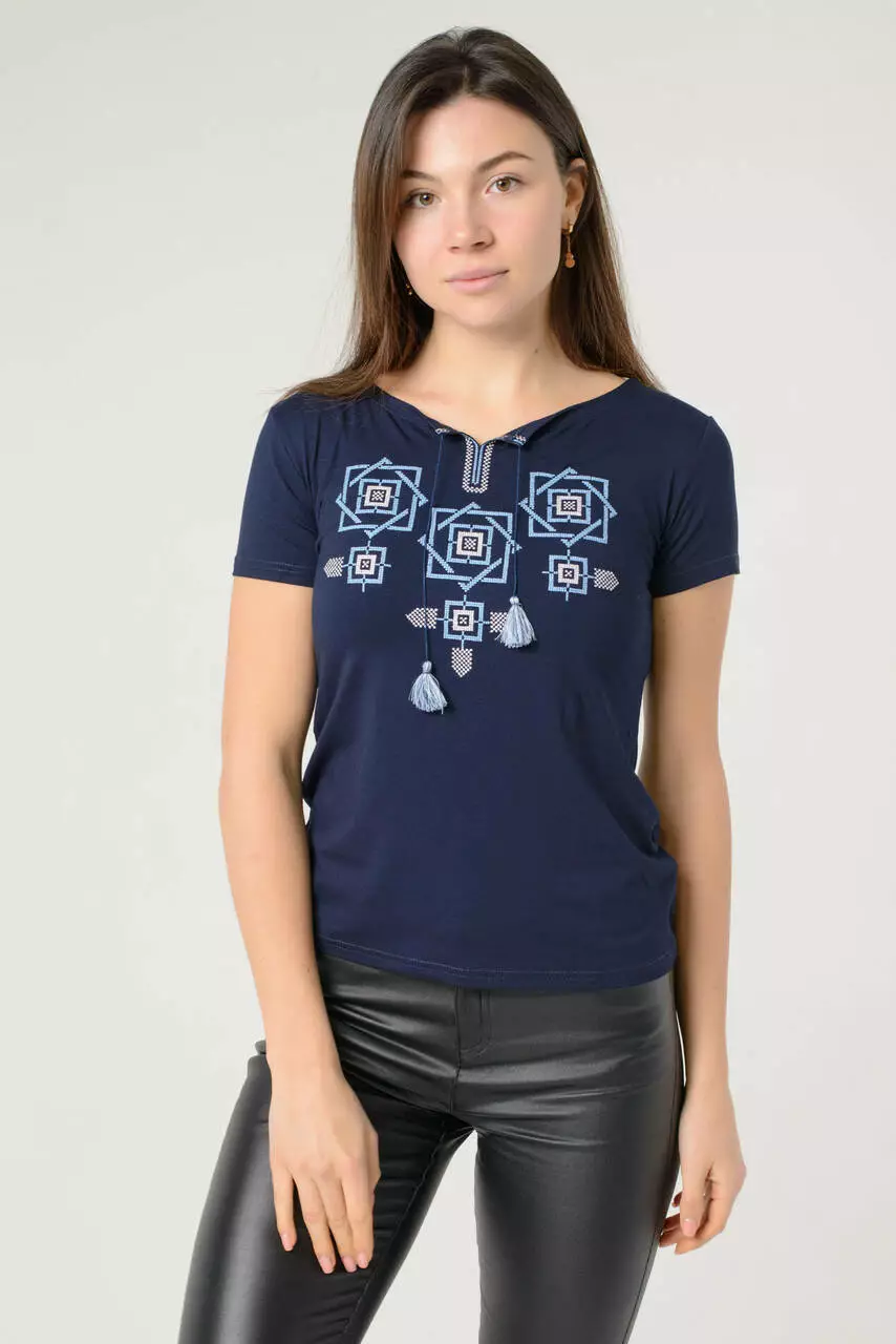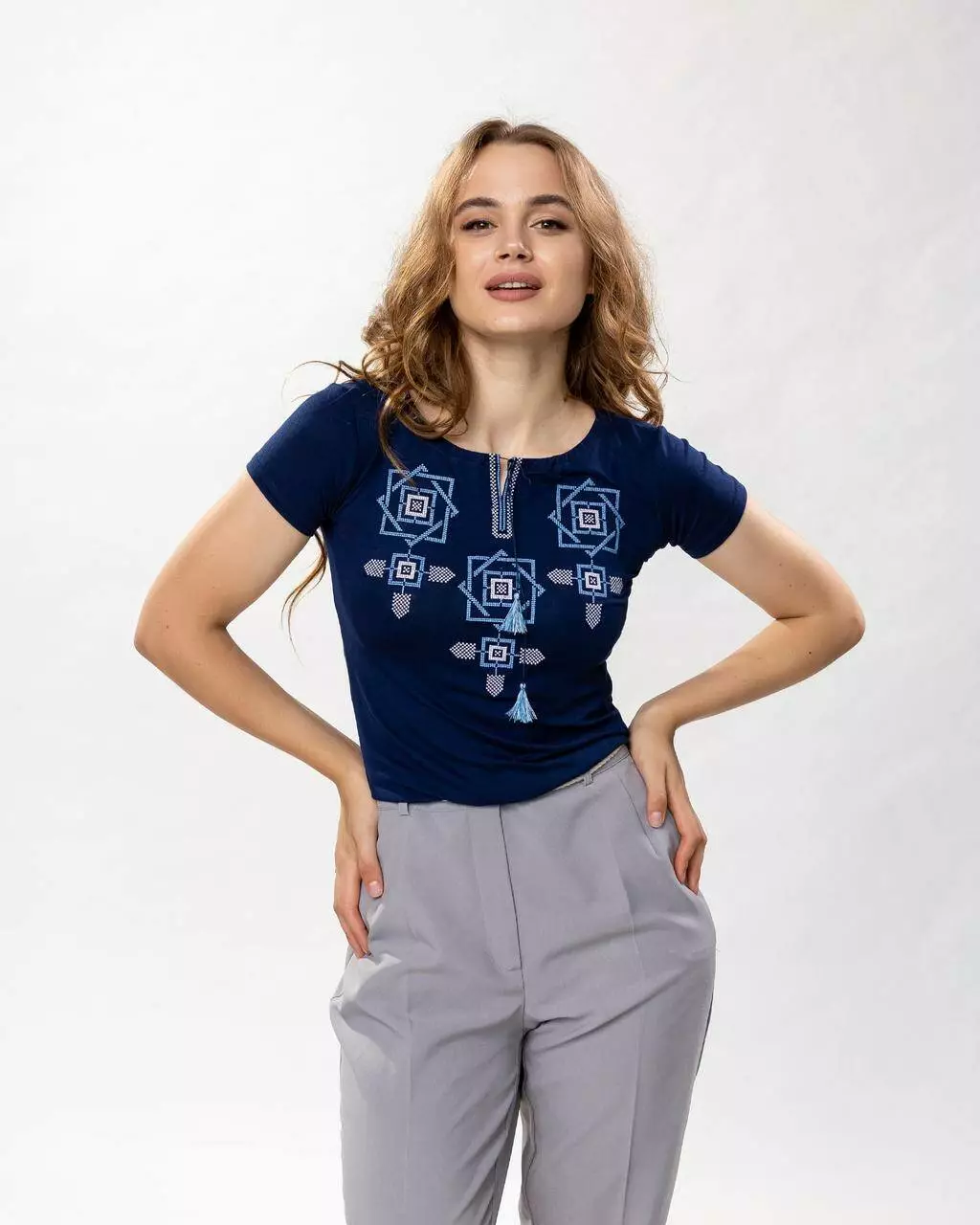 Жіноча футболка з вишивкою хрестиком у темно синьому кольорі «Оберіг»