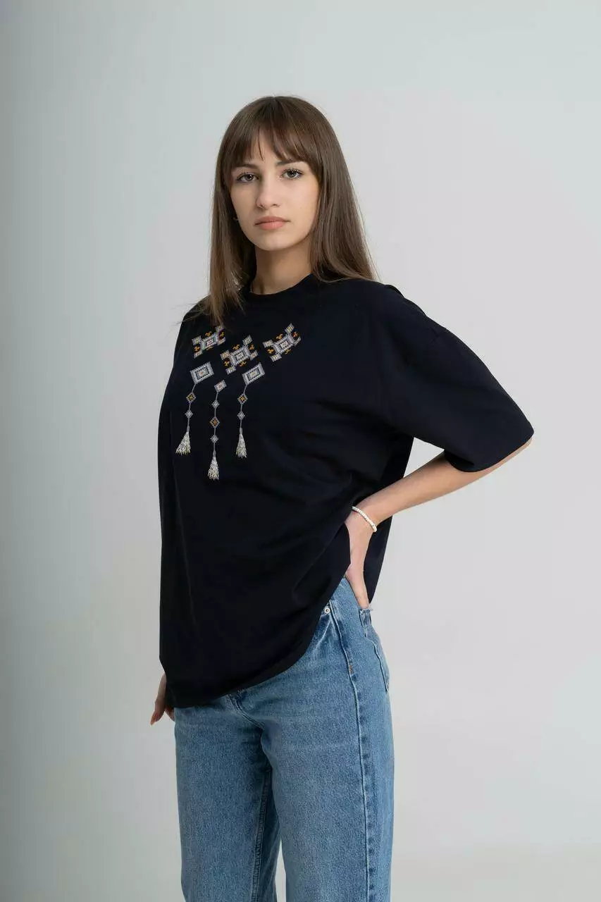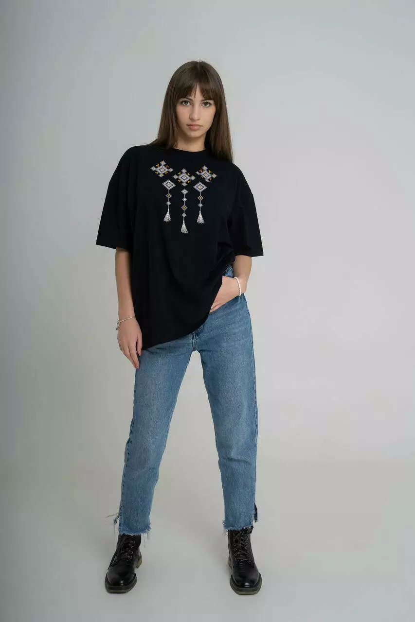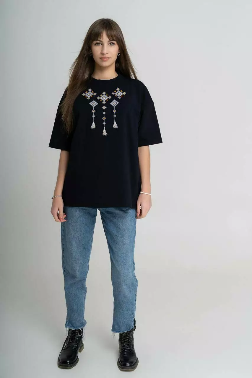 Жіноча оверсайз футболка чорного кольору з геометричним візерунком "Меланія"