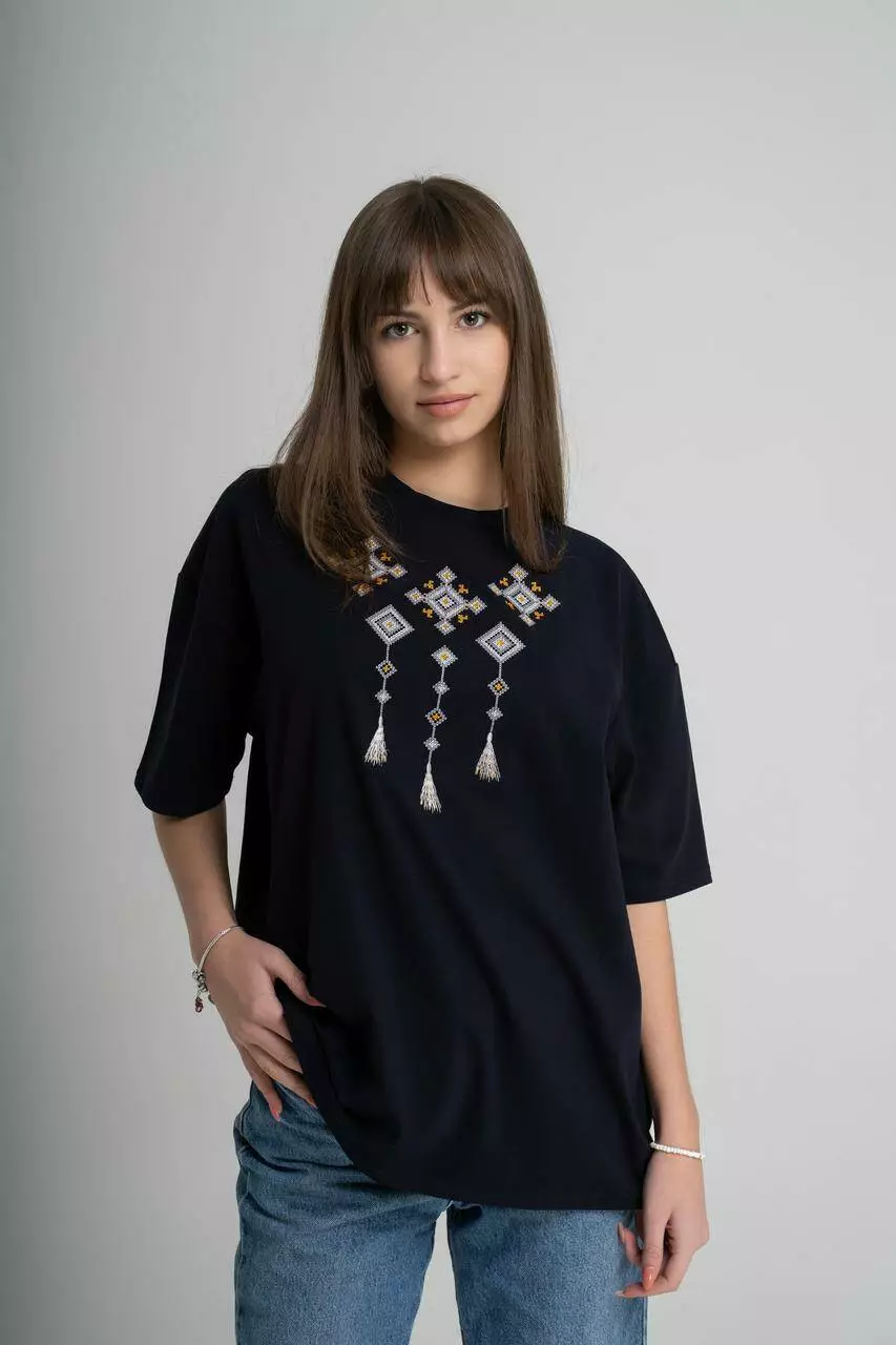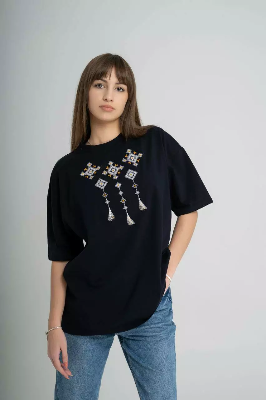 Оверсайз футболки це передусім про зручність та комфорт. Саме тому дизайнери MELANIKA, розробили модель жіночої футболки чорного кольору з геометричним візерунком.