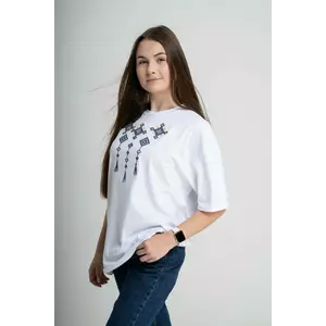 У цій моделі лінія плеча подовжена, краї низу прямі, а короткі широкі рукави створюють ефект тієї самої трендової футболки ніби з чоловічого плеча. З такою річчю ти зможеш поєднувати стильні штани, шорти та джинси різних фасонів. Але головною особливістю цієї футболки є геометричний вишитий орнамент на грудях. Так сказати це вишита футболка із сучасним акцентом.