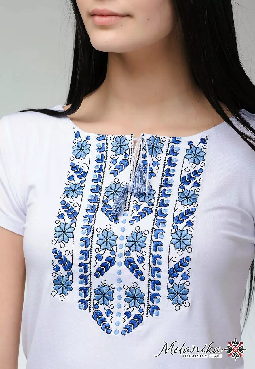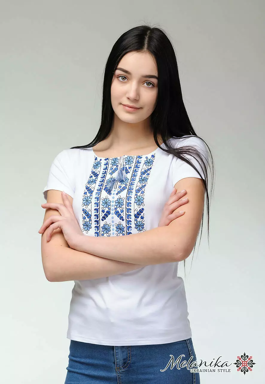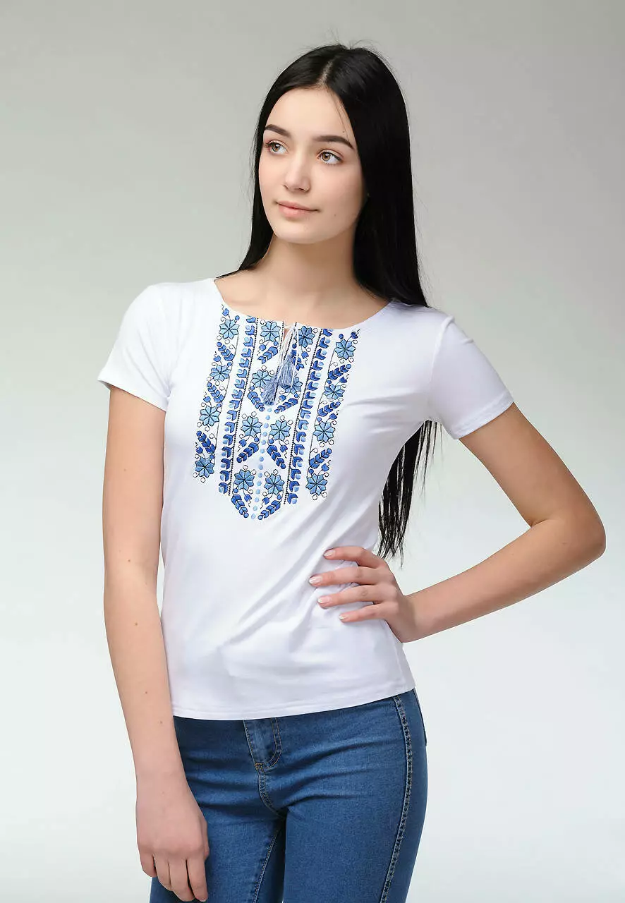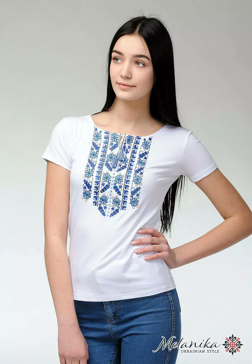 Легка та стримана модель жіночої вишитої футболки на короткий рукав знайшла своїх поціновувачів. Така річ незамінна в гардеробі школярки, студентки або ж вже зрілої жінки. Особливу увагу слід привернути до унікального орнаменту. Для його створення майстри обрали нитки ніжного блакитного кольору та його відтінків. В геометричному стилі зображено рослини, і це можна простежити, коли ближче його оглянути.