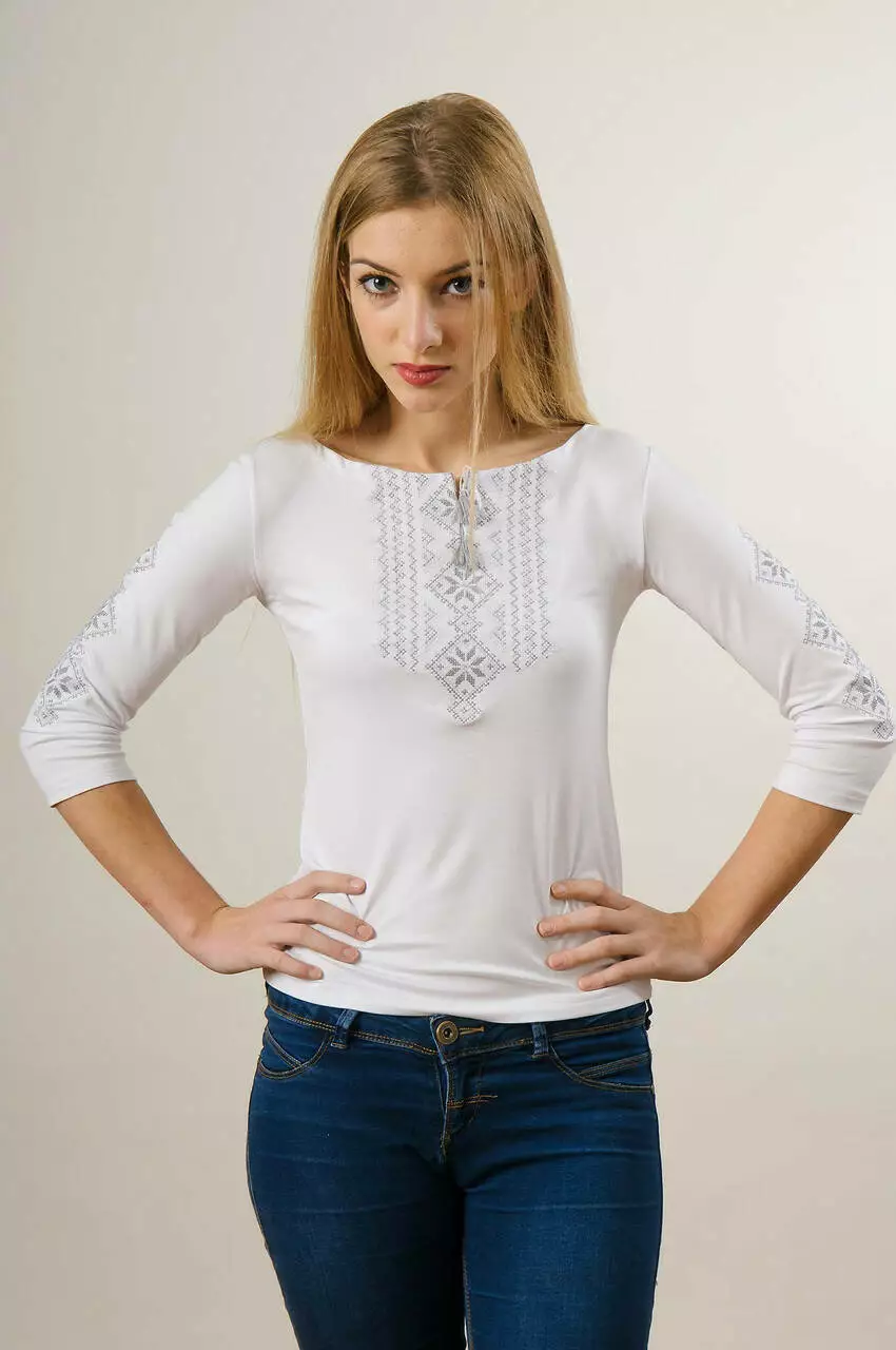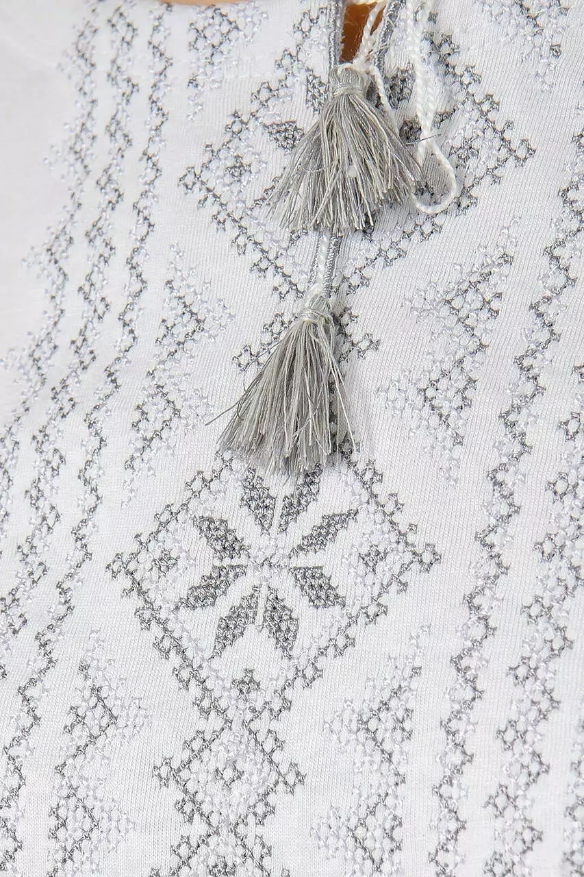 Акуратна вишита футболка білим по білому - це еталон ніжності та жіночності. Красивий геометричний орнамент на рукавах та грудях створений на основі зразків традиційної української вишивки. Срібна вишивка чудово виділяється на білому фоні та створює настрій стриманості та жіночої сили. У вишивці закладений оберіг ромб, який захищає від різної нечисті. Головний візерунок вишивки розташований в зоні декольте, так як вимагали наші предки, аби захищати серце.