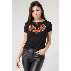 Жіноча вишита футболка на короткий рукав у чорному кольорі «Маковий цвіт»