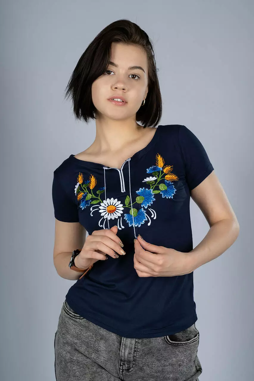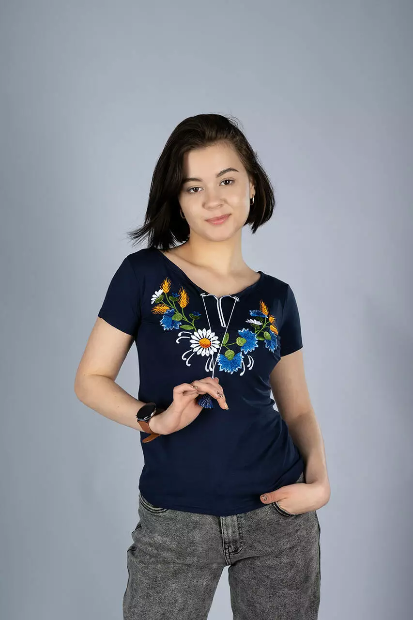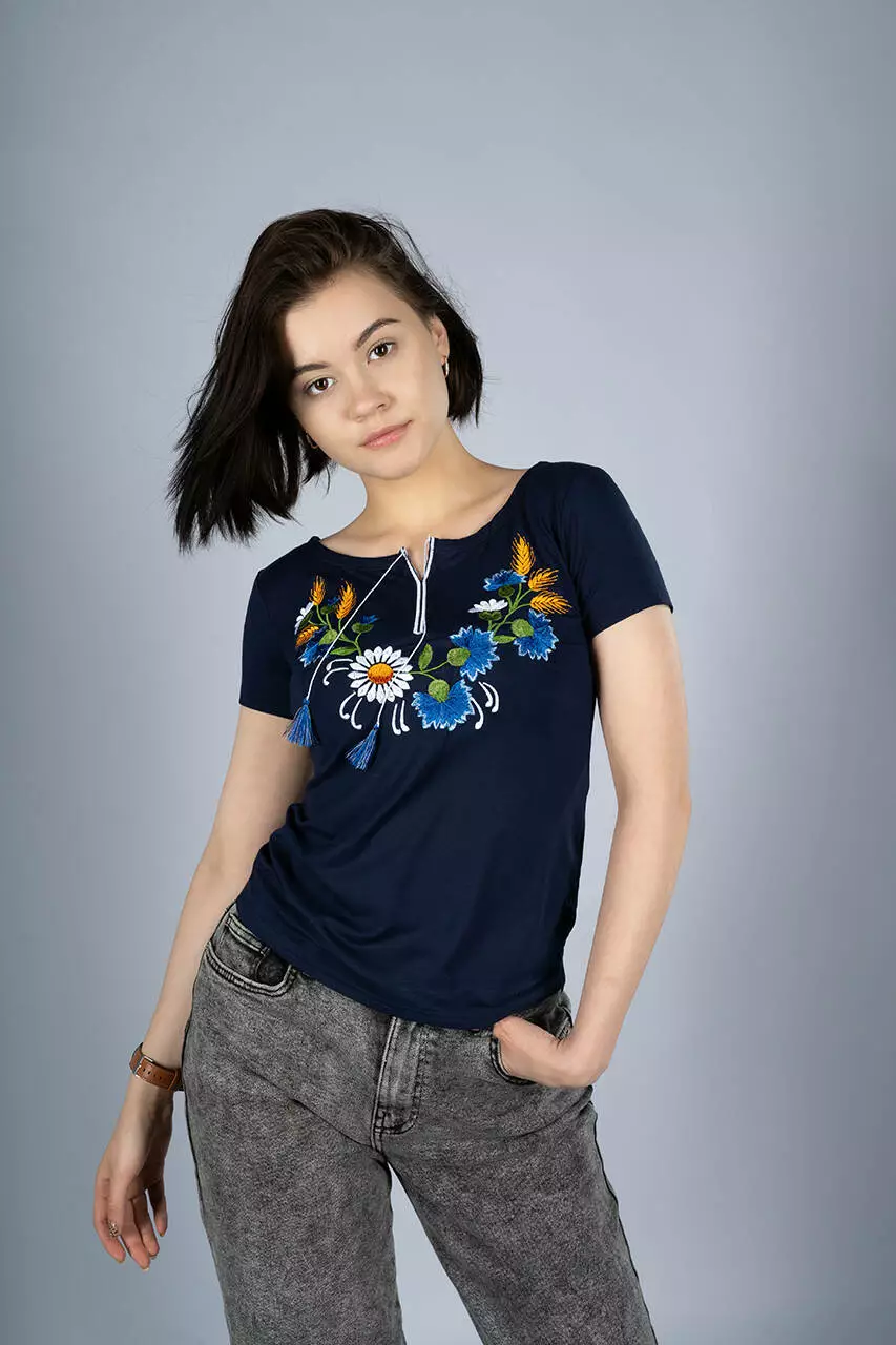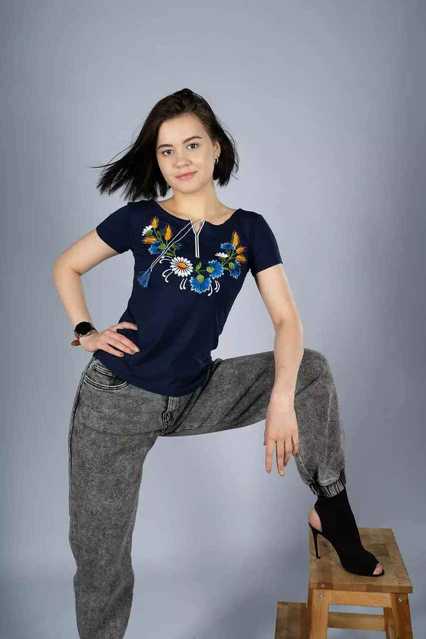 Жіноча вишита футболка темно-синього кольору із квітковим орнаментом в українському стилі «Віночок»